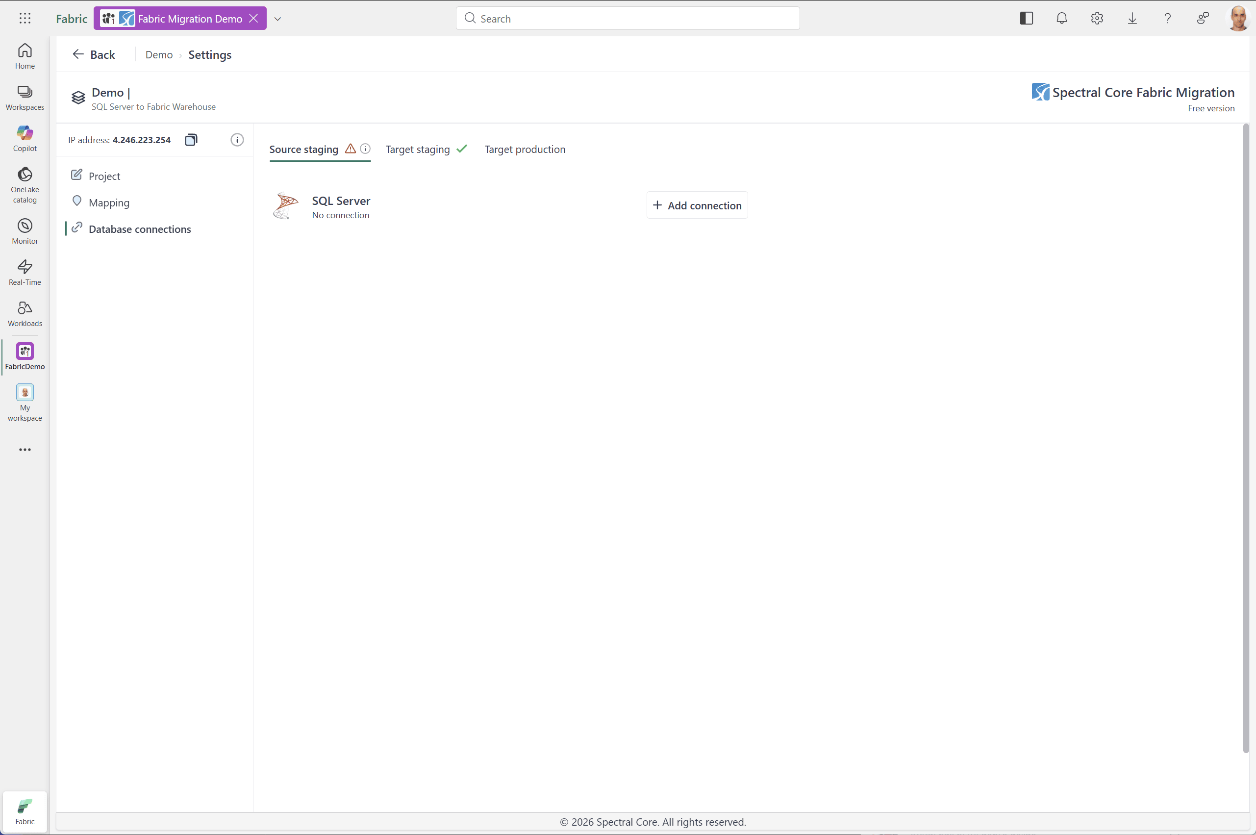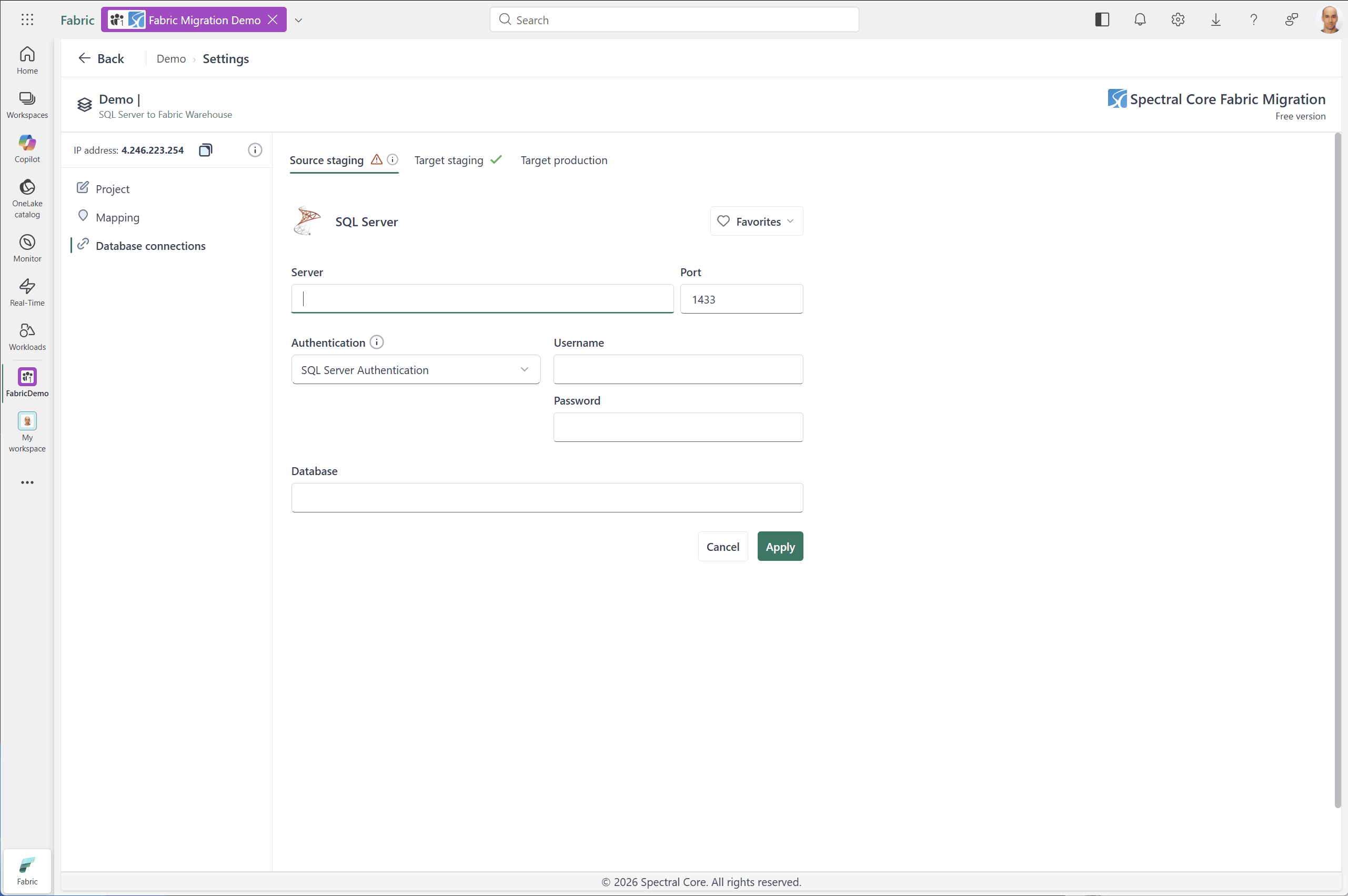 Please note you may need to allow our IP address to connect. You can use either SQL Server authentication, or Service Principal. We recommend Service Principal because you can use a short-lived token, which is more secure.