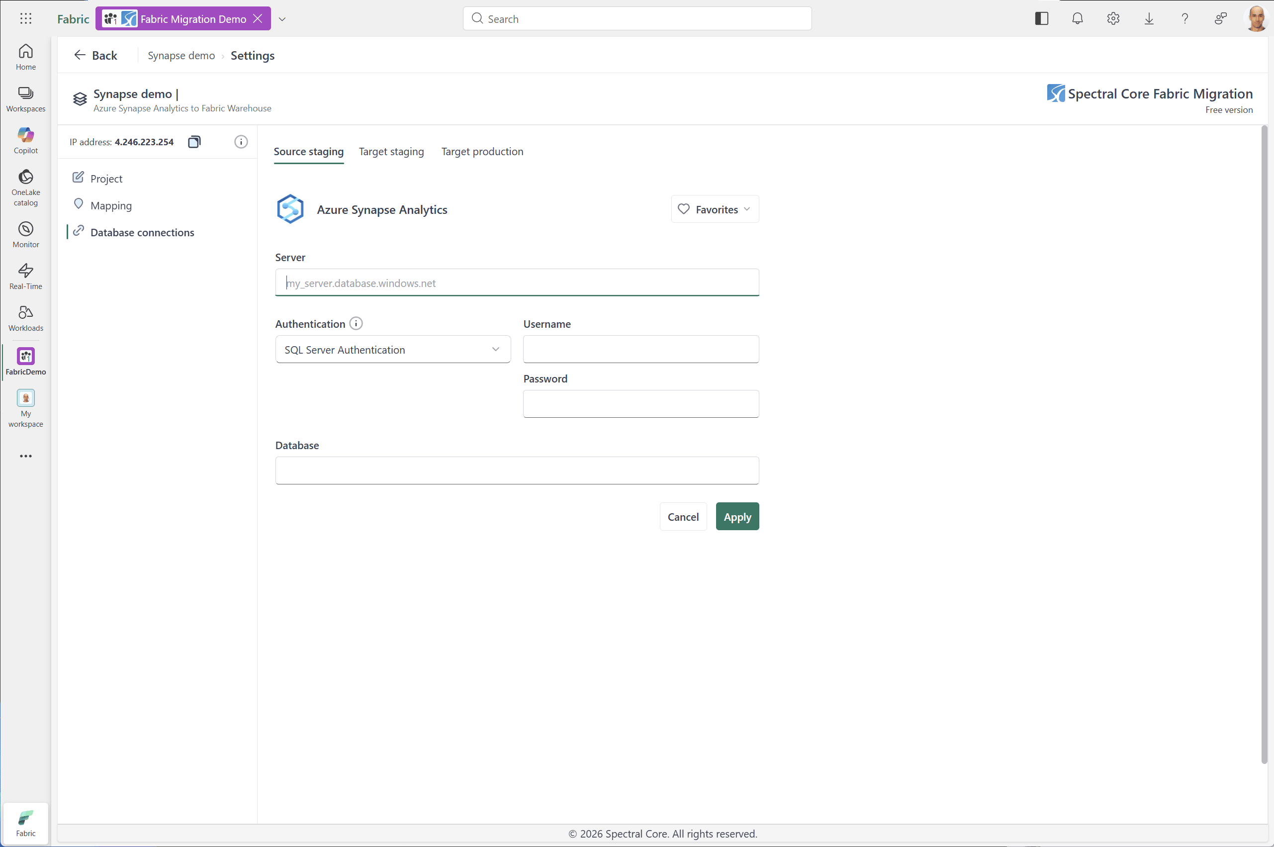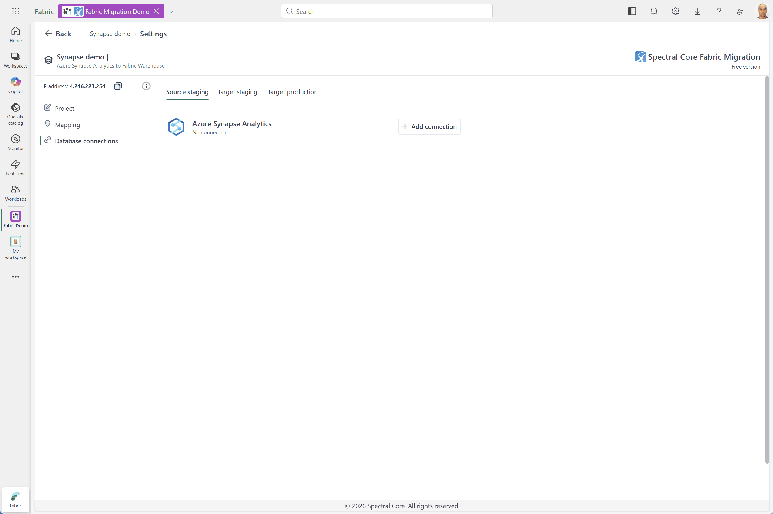 Click Add connection and specify the connection information. Make sure to allow Fabric Migration workload IP in the Synapse Analytics server in Azure Portal. That's done in Security/Network page.