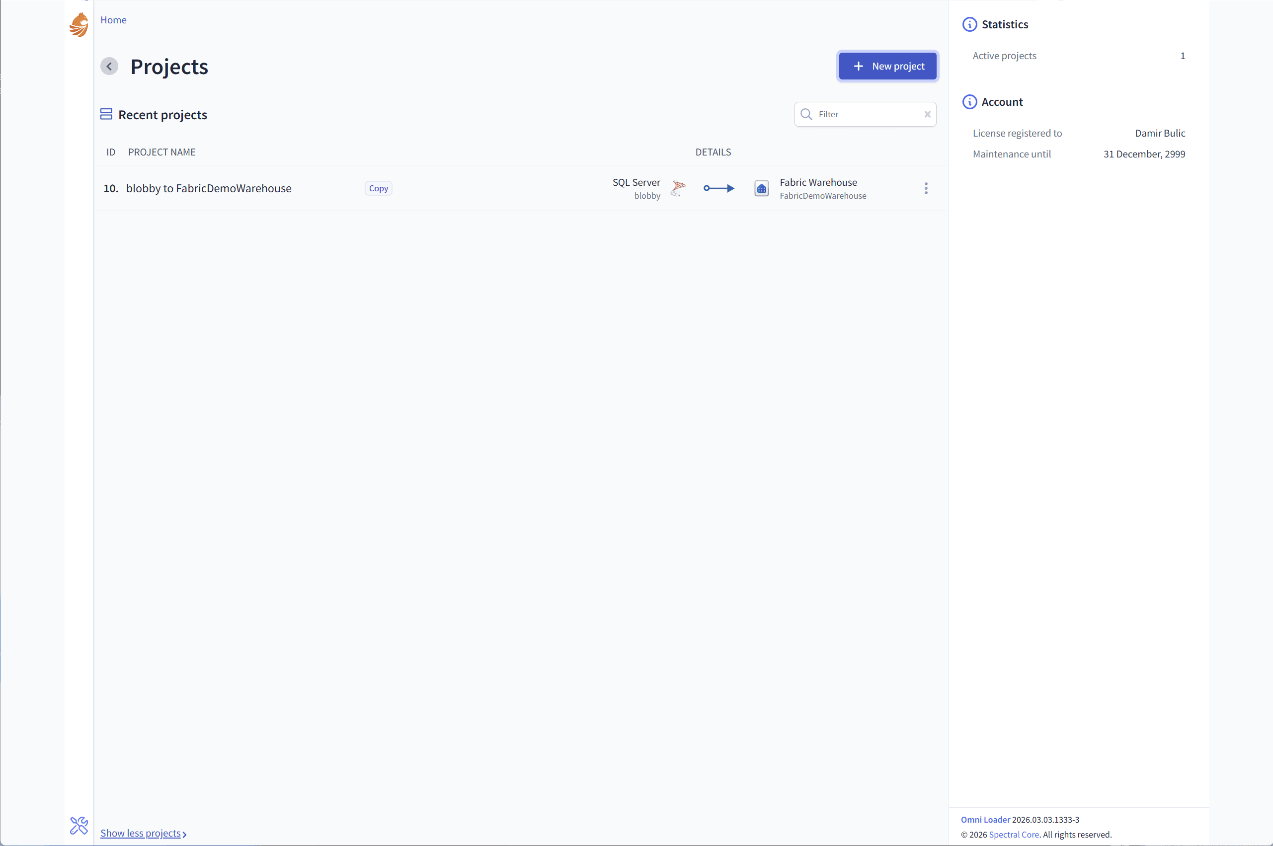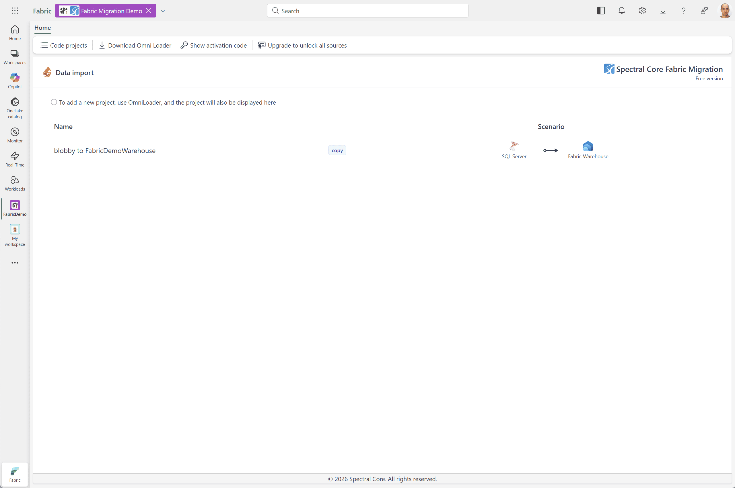 Once activated, the Fabric Migration workload will mirror information in Omni Loader. As an example, if Omni Loader has a single project, this is how the screen in it looks.