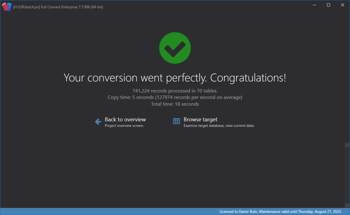 When conversion is completed, Full Convert will show you an overview of what has been done. You will see number of tables and records transferred, as well as time it took to do so.