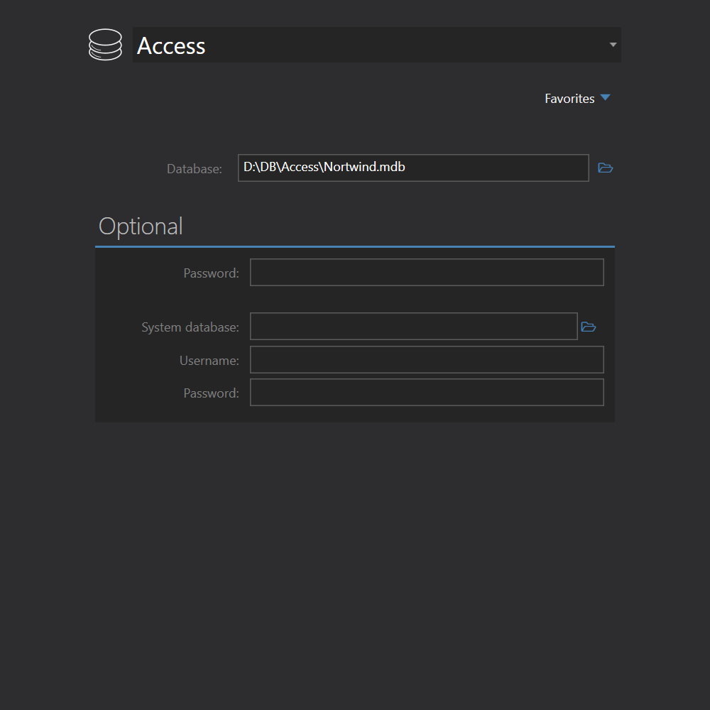 To connect to Access database, please specify its database file. Access database files end with either .MDB or .ACCDB extension.