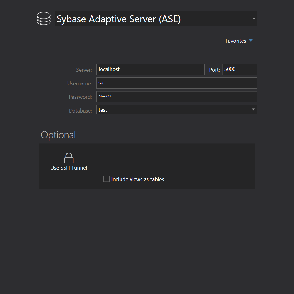 Sybase Adaptive Server Enterprise (known also as SAP ASE, Sybase ASE or simply Sybase) uses standard relational database connection parameters.