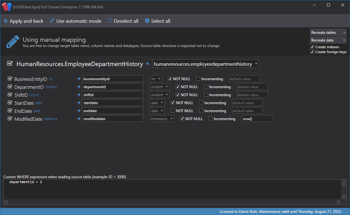 Use manual mapping when you want to have full control over how table is copied during conversion. Please note that once you use manual mapping for a table, settings here have precedence over options in Project options or Global settings.