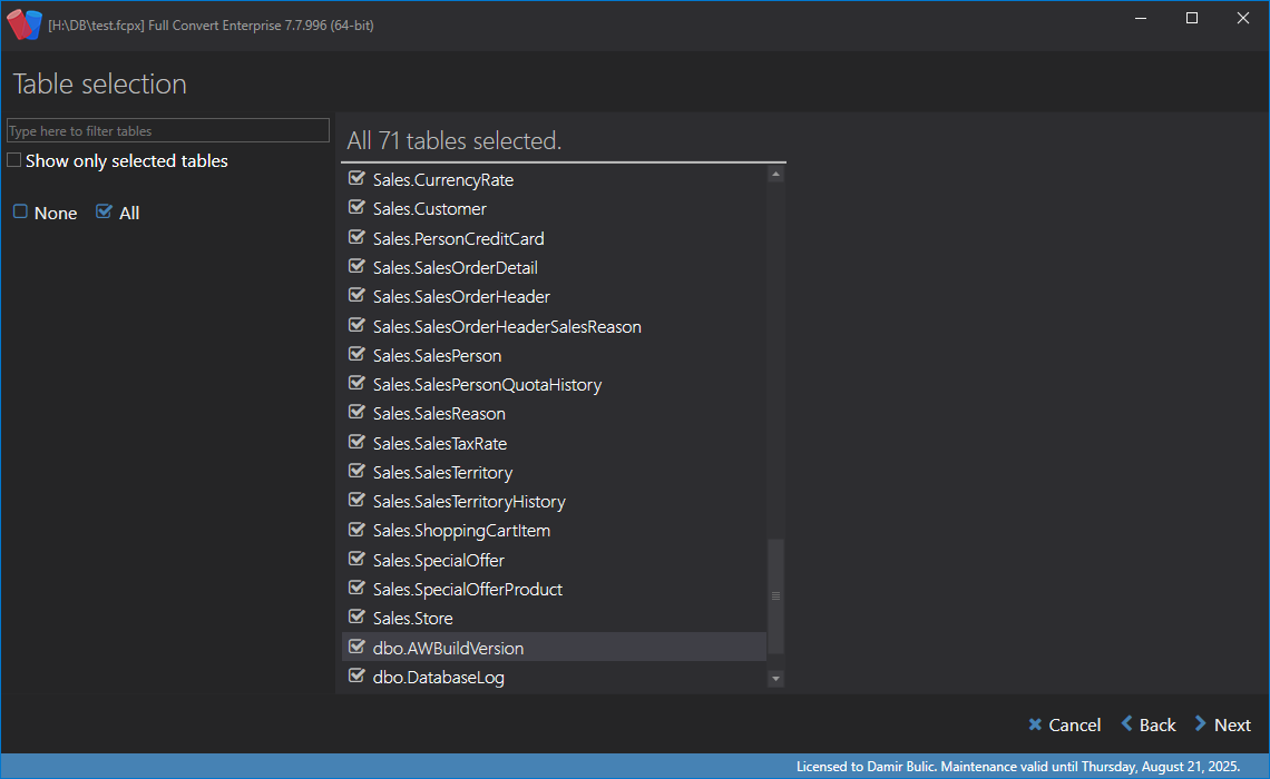 If you have many tables, use filter to quickly find table(s) you need and avoid scrolling through many tables names. As you type filter, we update table list in real-time. Please note that filtering table names does not remove any tables from the list of tables to convert. This feature is designed for you to narrow your search when dealing with tables. Use Toggle listed button to de/select tables satisfying your filter criteria. So, if you only want to select few tables for conversion, first deselect all by clicking None, then filter to locate your tables and select ones you need.
