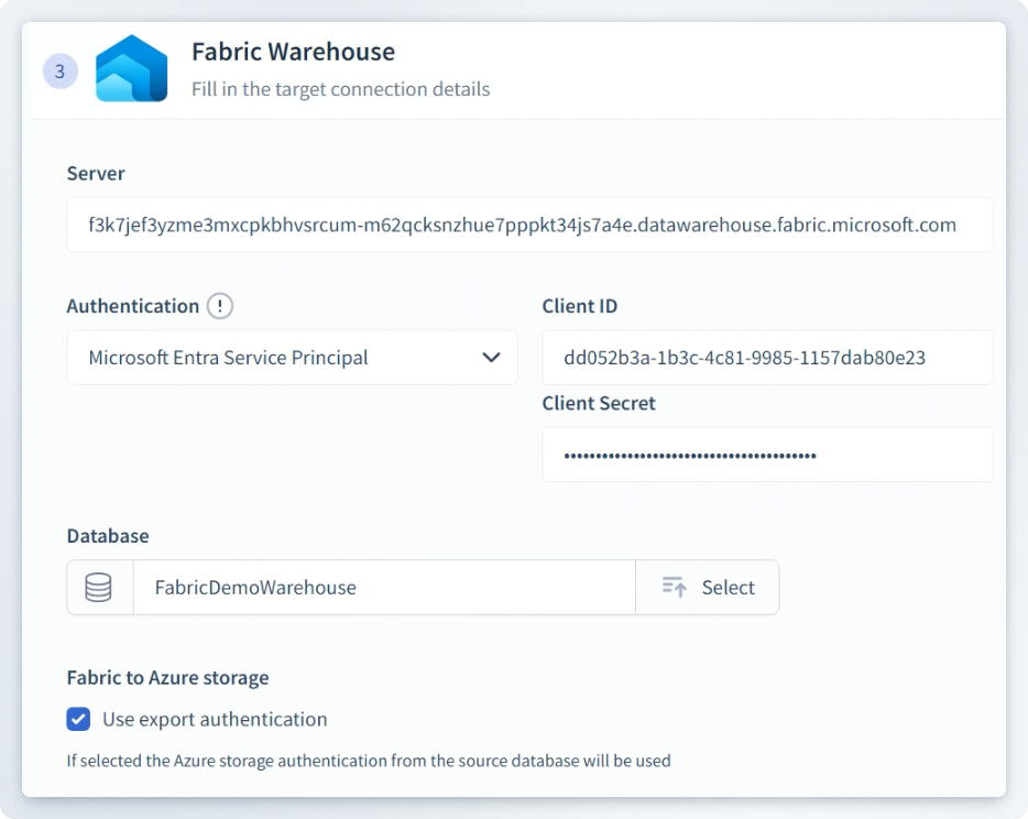 Select or configure a connection to Fabric Warehouse using the drop-down menu.