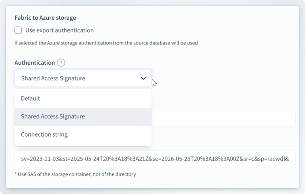 If export authentication is deselected, you can specify a way connect to the storage that differs from Synapse.