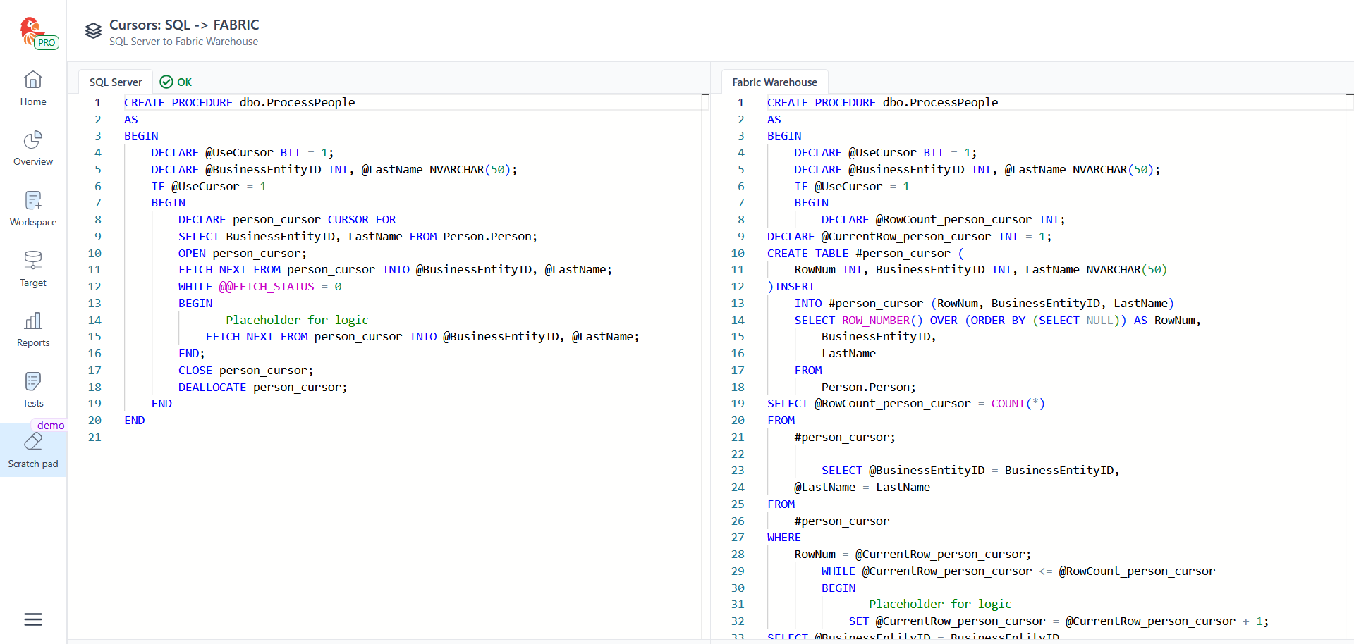 Microsoft Fabric Warehouse, however, does not support cursors natively, nor does it have block-scoped or session-scoped temp tables in the same way. This creates challenges when translating control flow code that relies on repeated or nested cursor declarations, particularly regarding temp table reuse and naming.