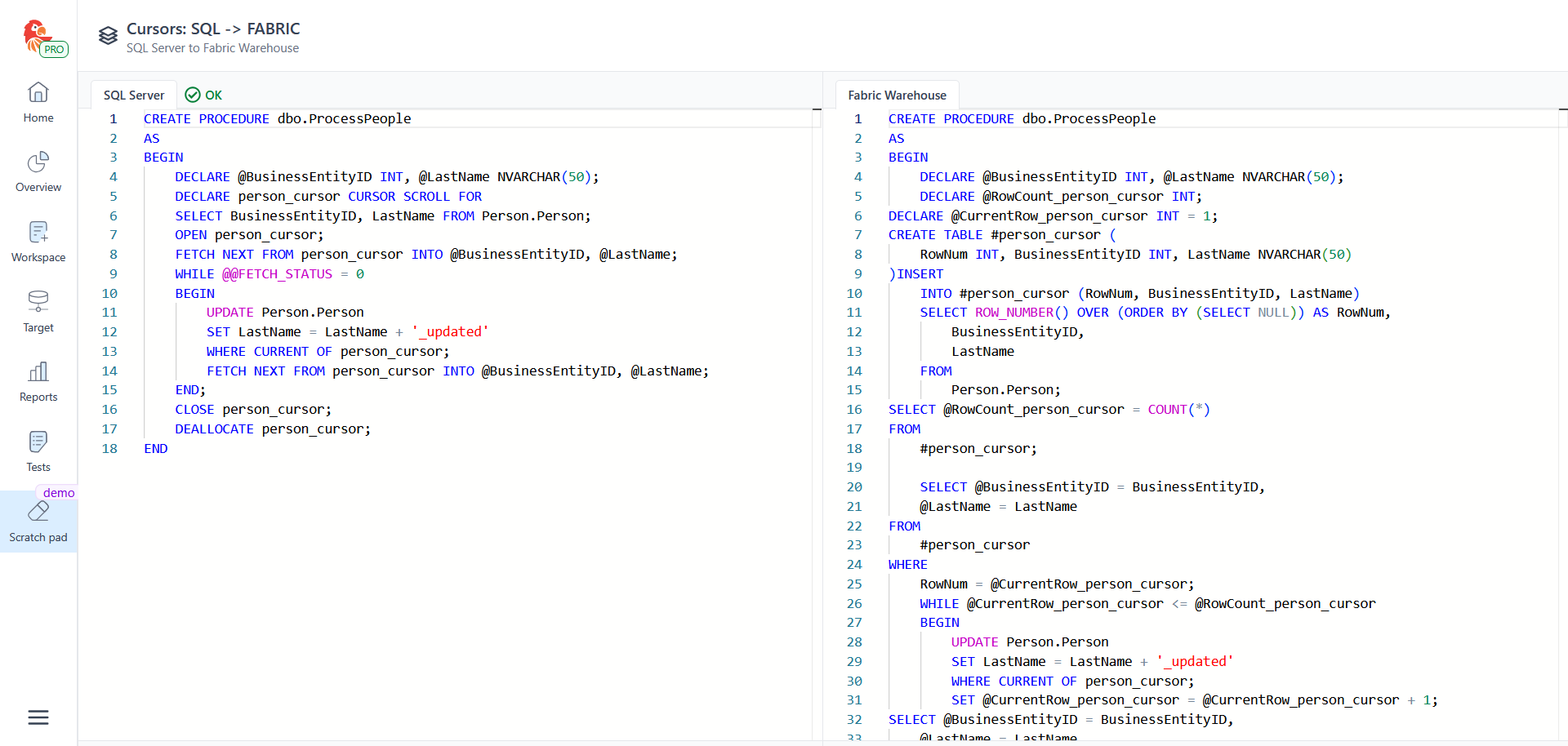- Potential semantic mismatch: If the original cursor relies on positional targeting without a key-based match, the translated Fabric code will not preserve the same behavior. A redesign of the logic may be needed.