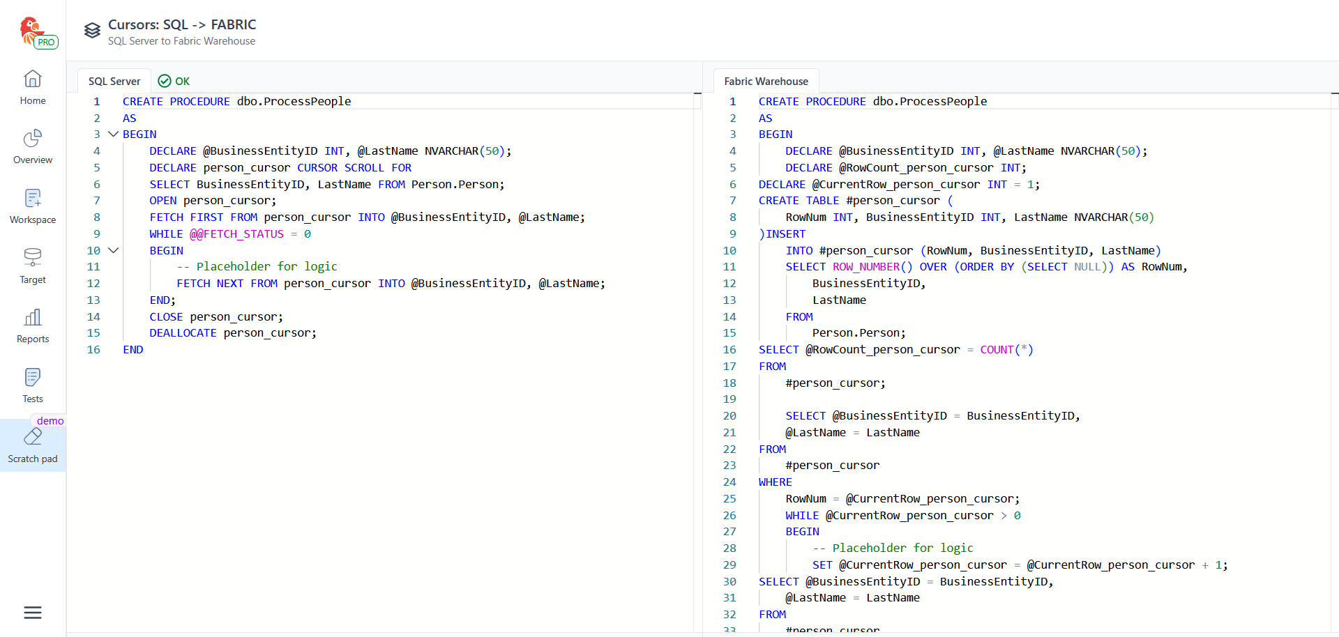 FIRST:FETCH FIRSTis effectively translated asRowNum = 1without explicit acknowledgment. There is no diagnostic or annotation in the output indicating that this specific intent was recognized. - Manual review strongly recommended: Any use of advanced fetch directions should be carefully reviewed after translation, as the current SQL Tran output either ignores, partially mishandles, or blocks these cases. This could lead to incorrect or incomplete Fabric logic.