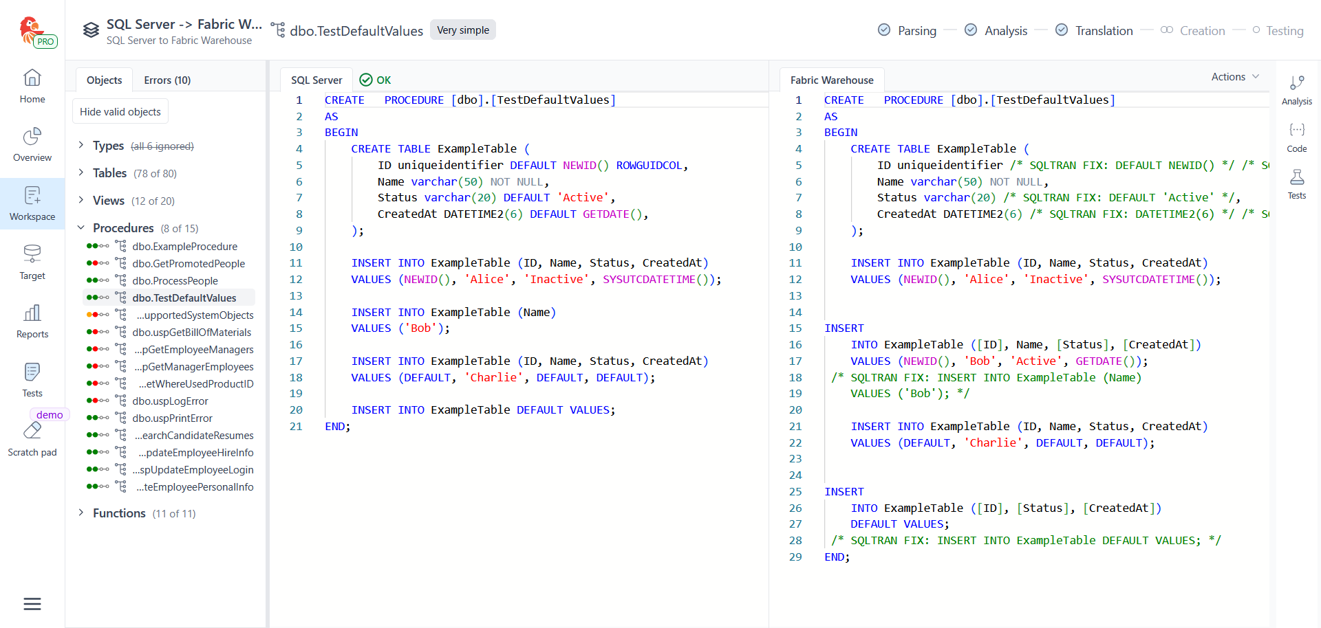 DEFAULTexpressions from table definitions. SQL Tran comments out default constraints using/* SQLTRAN FIX: DEFAULT ... */. - Preserving the column structure but stripping unsupported features such as