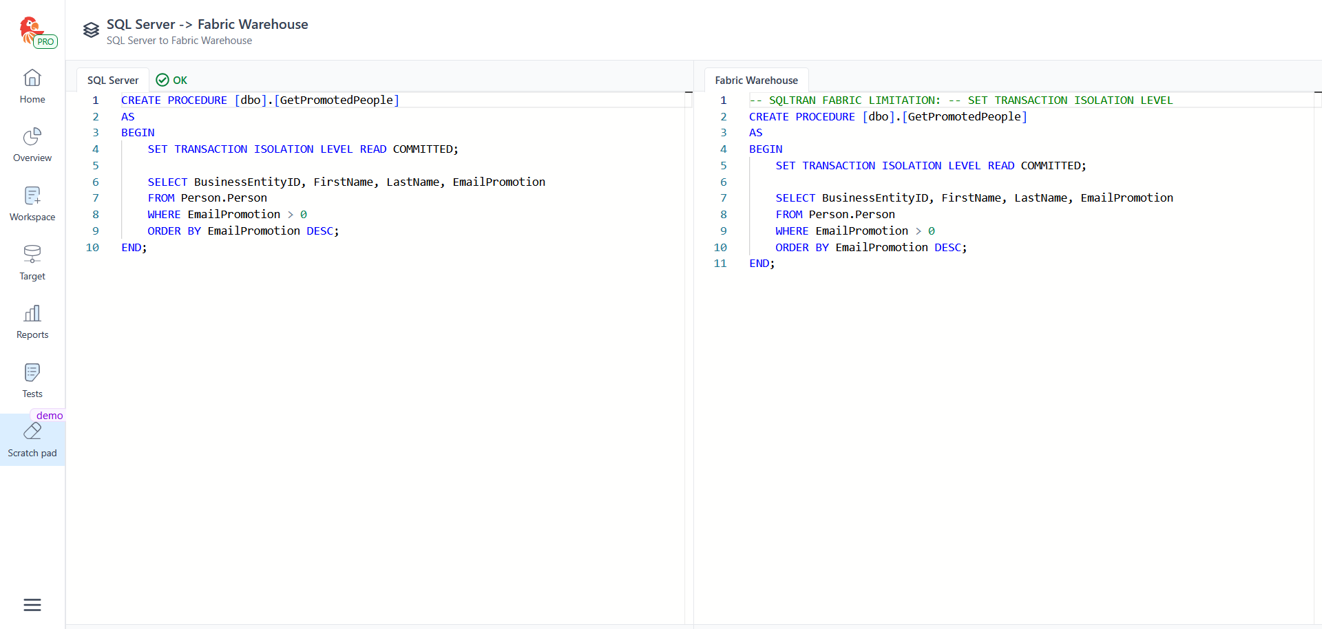 END;Fabric Warehouse (generated by SQL Tran):