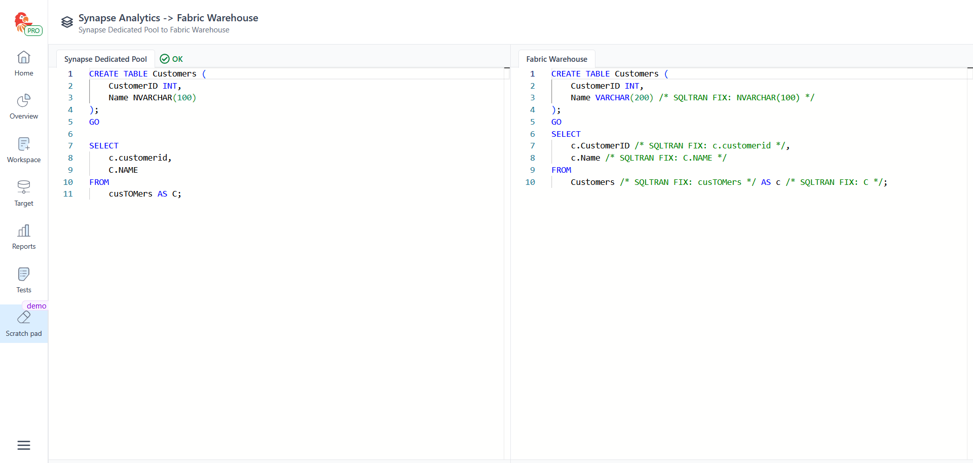 SQL Tran automatically rewrites object and identifier references to ensure consistent casing across all usage points, while conforming to Fabric’s case sensitivity rules where required.