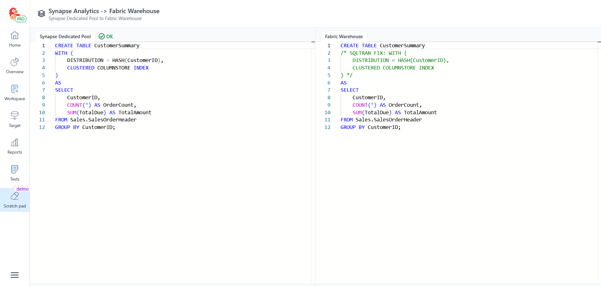 GROUP BY CustomerID;Fabric Warehouse (generated by SQL Tran):
