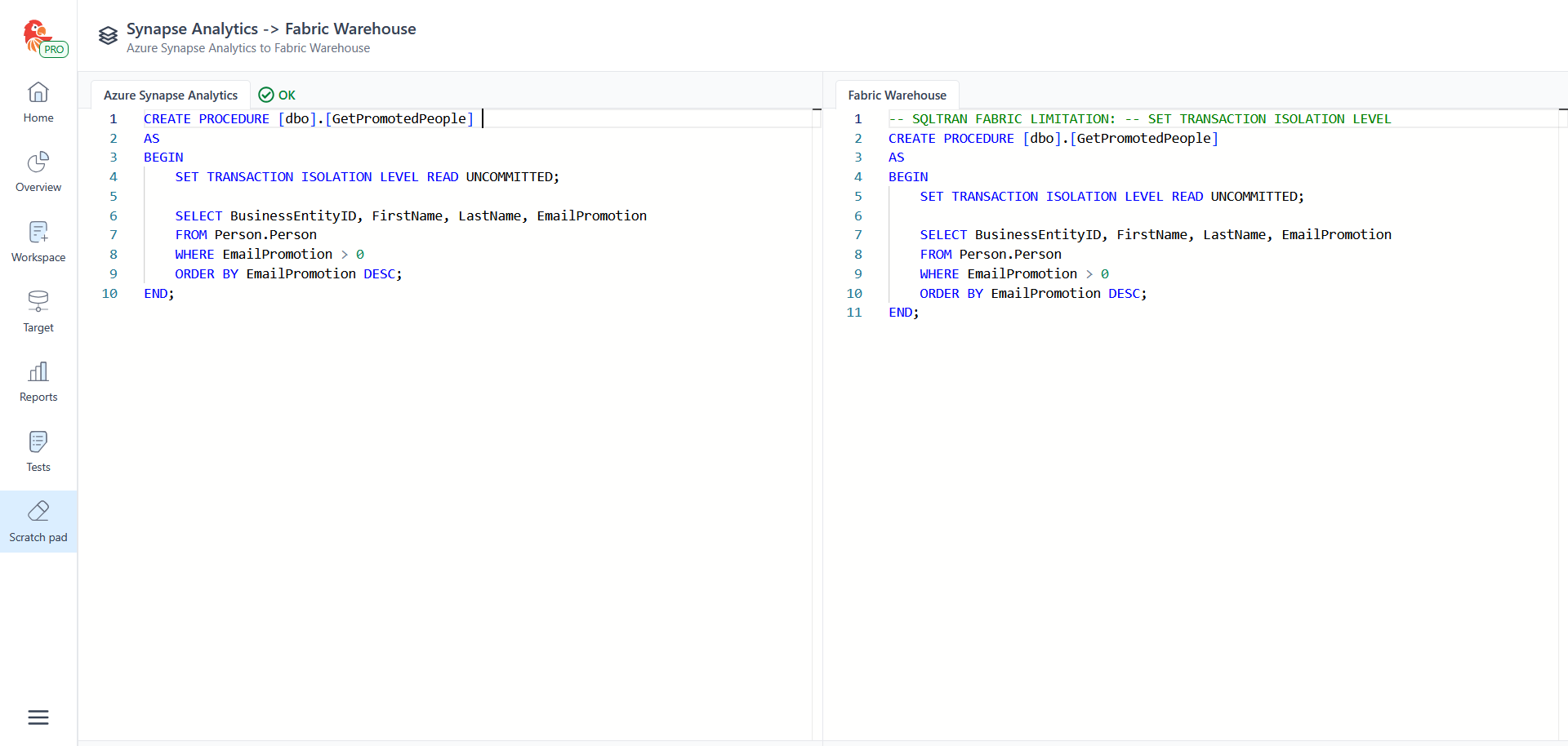 END;Fabric Warehouse (generated by SQL Tran):