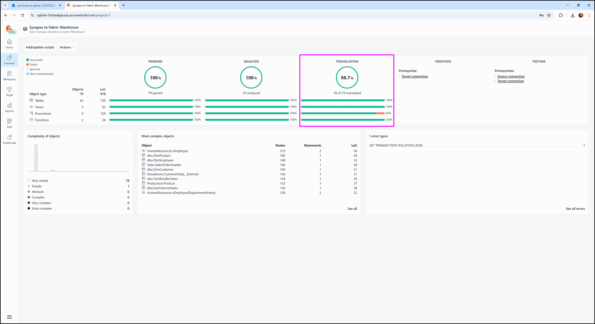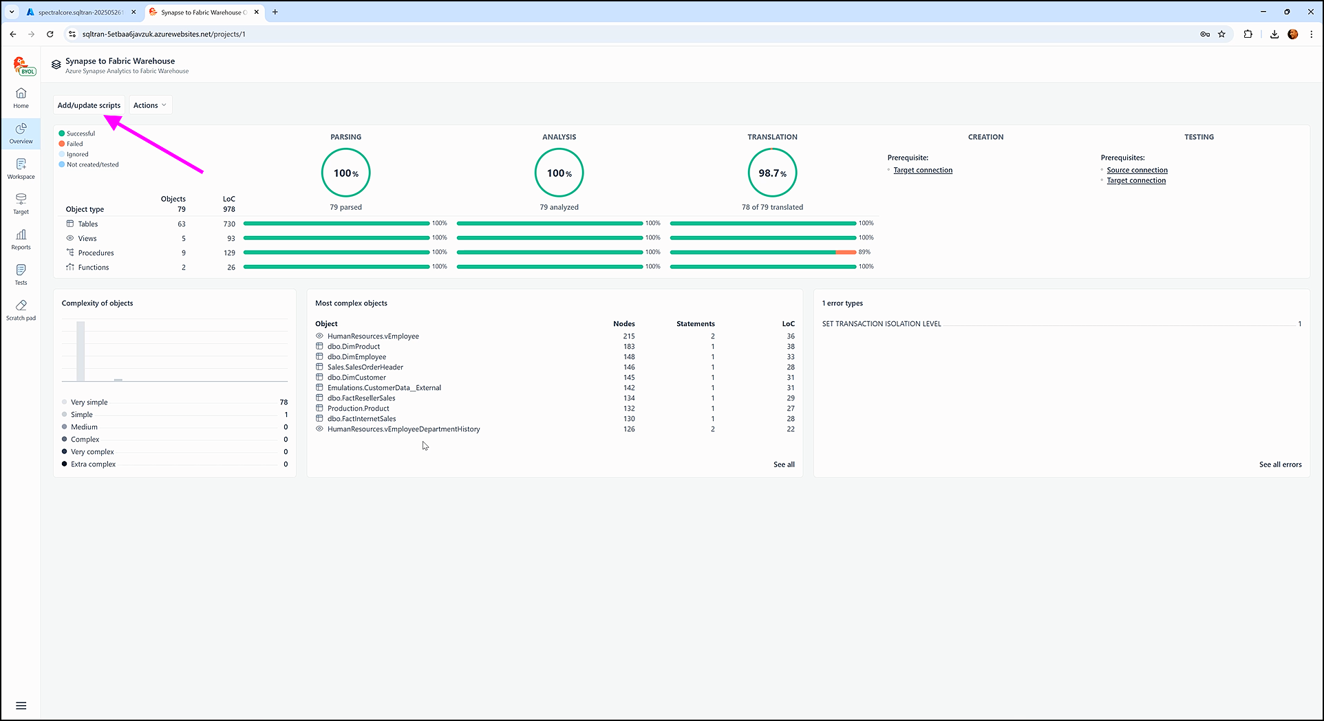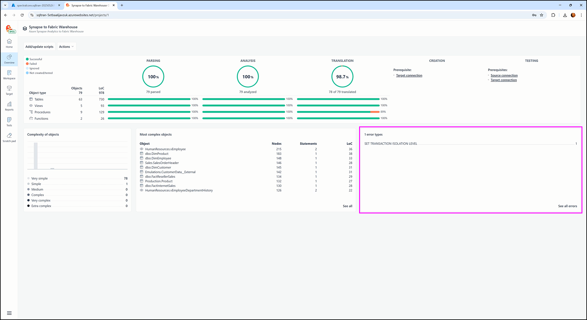 Converts source SQL into the equivalent syntax for the Fabric Warehouse target environment.