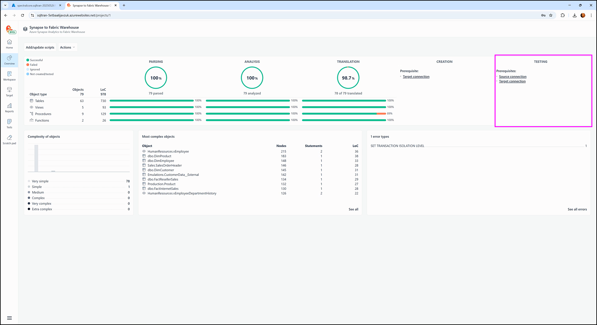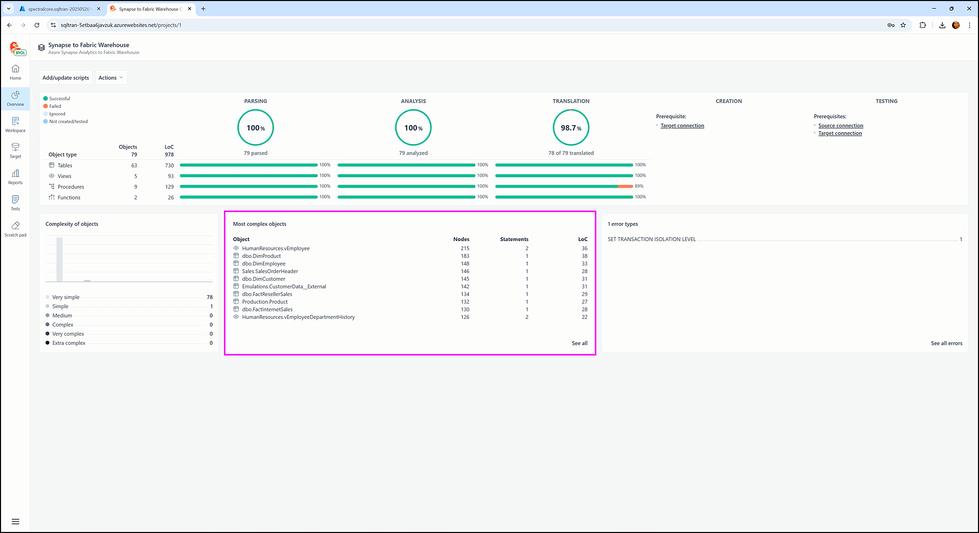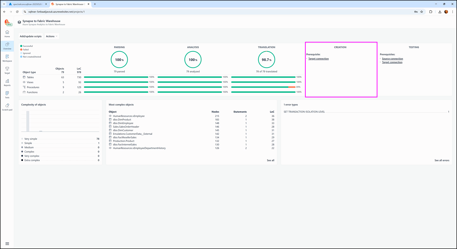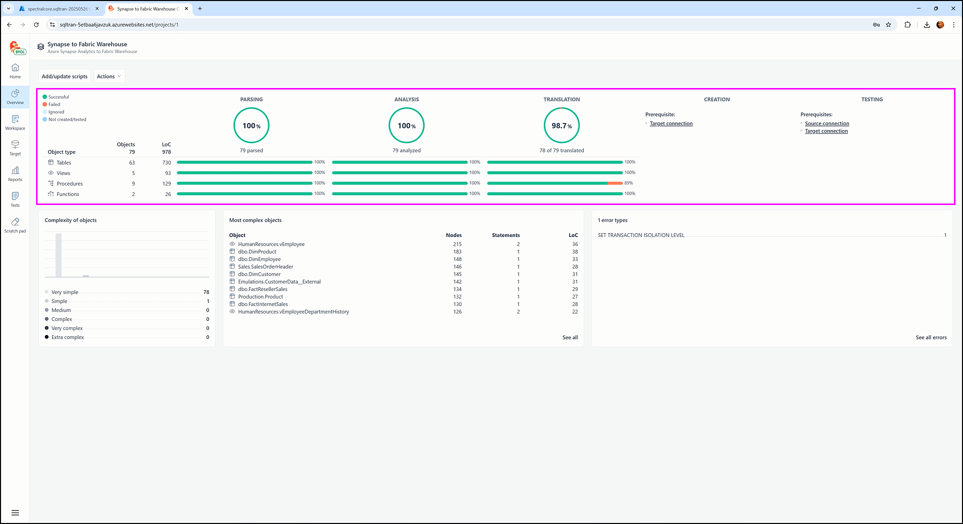 Converts source SQL into the equivalent syntax for the Fabric Warehouse target environment.