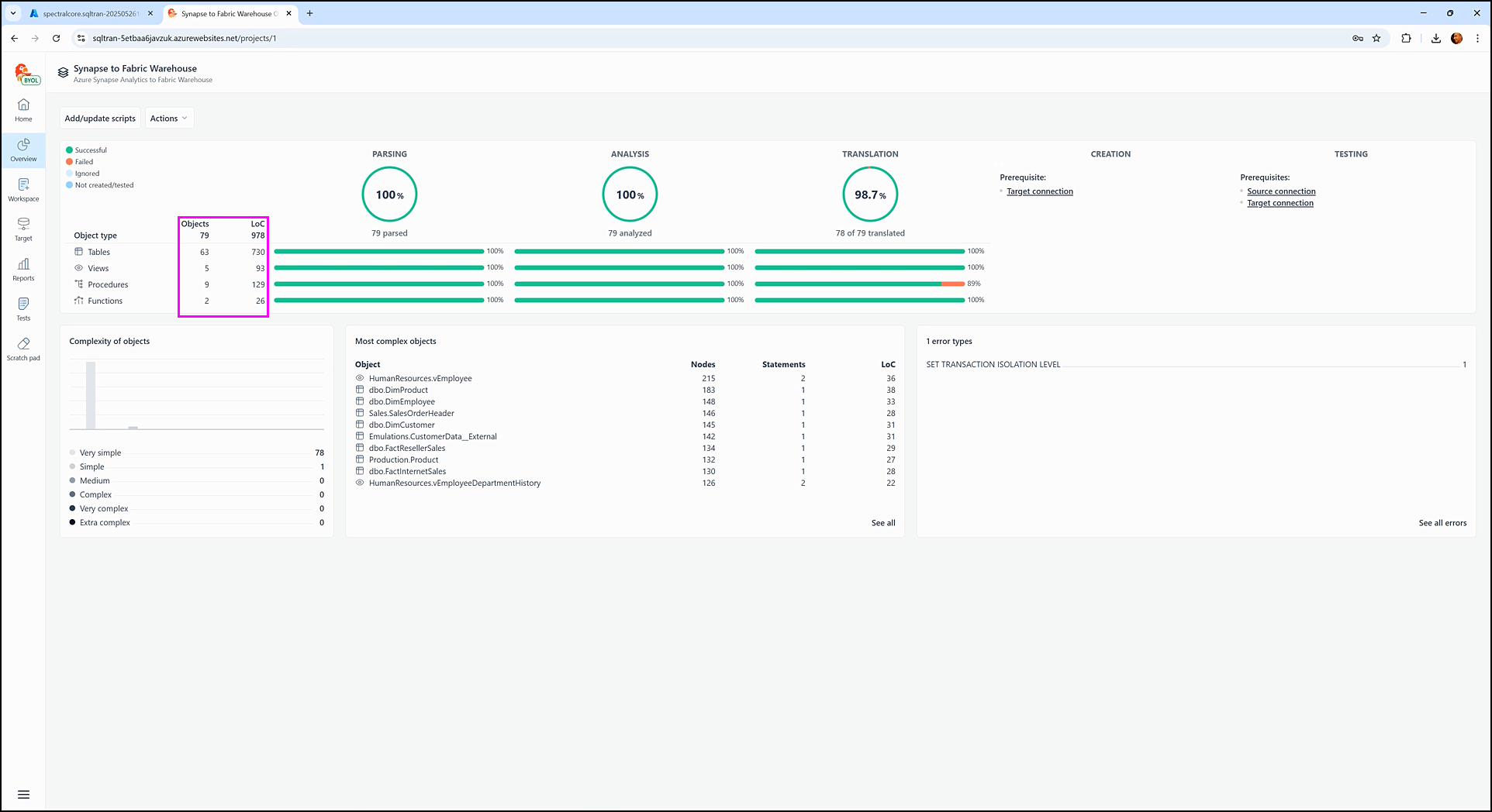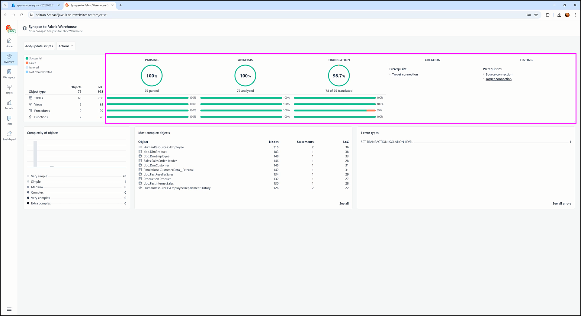 After creating a project, the Overview screen is the first thing you'll see. This screen acts as an assessment hub, showing a complete snapshot of your database migration progress, statistics, object complexity, and potential issues.
