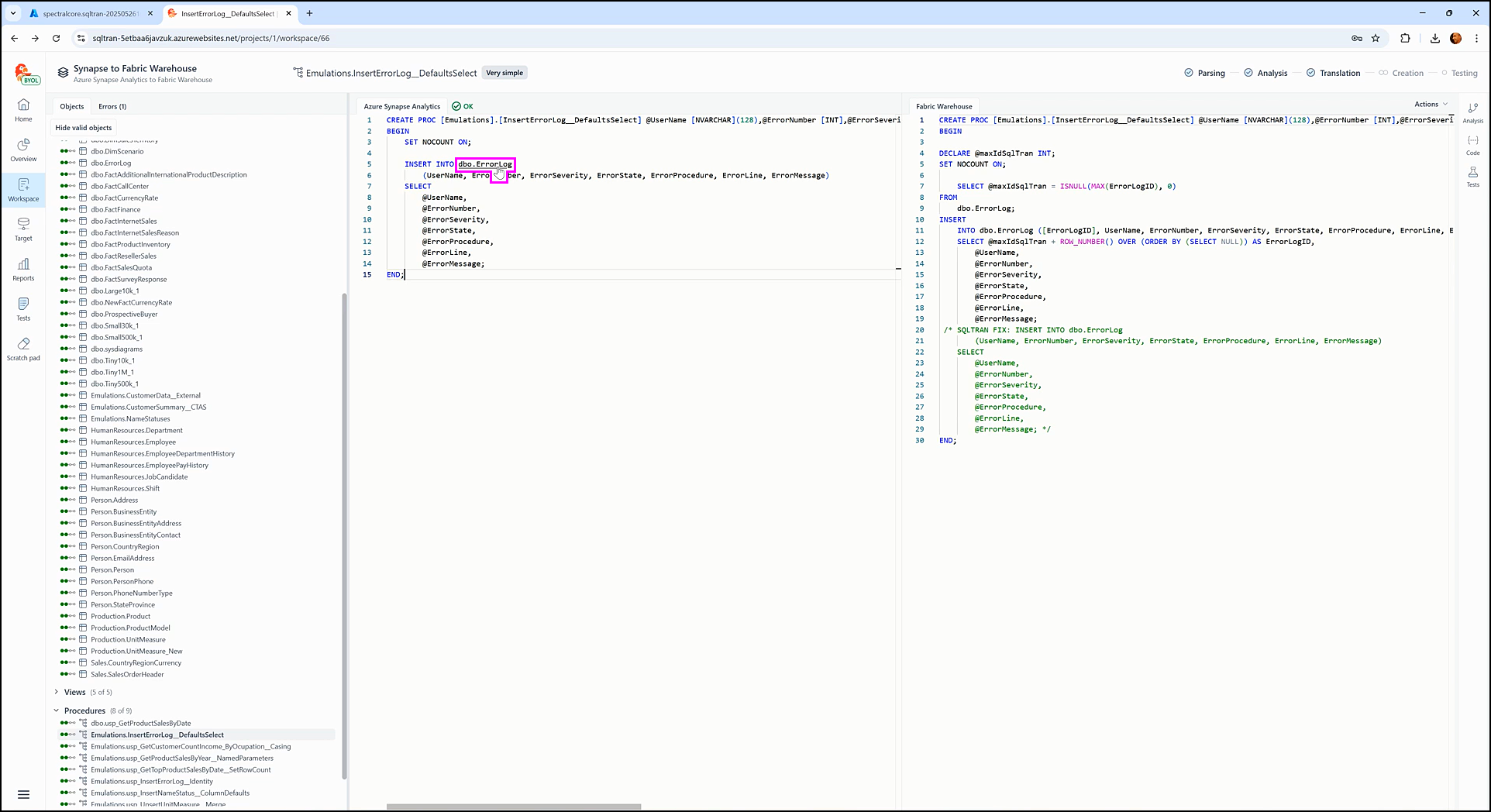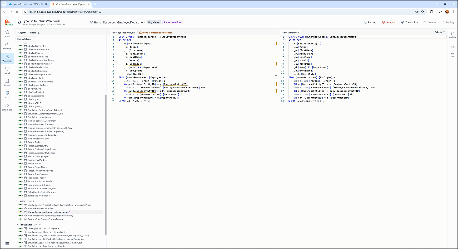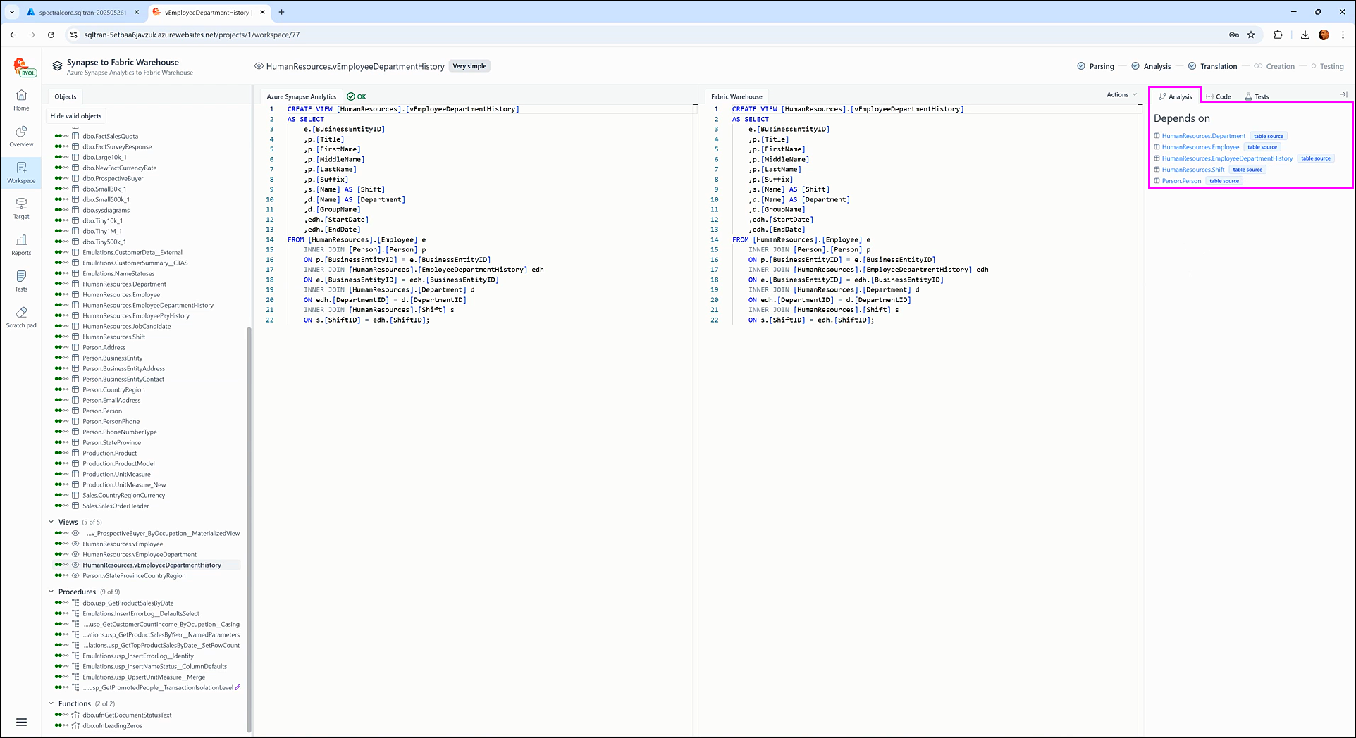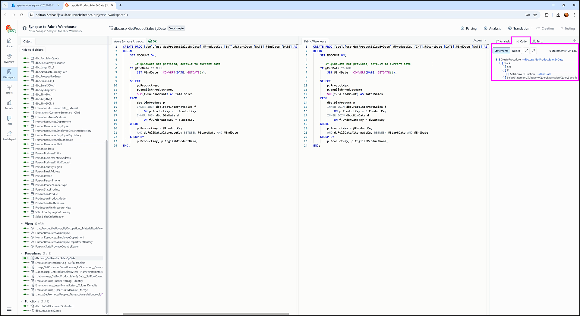Azure Synapse Analytics) in the source pane. - The translated SQL code for the target system (e.g.,