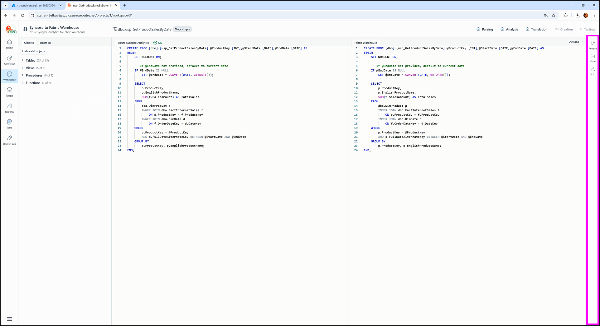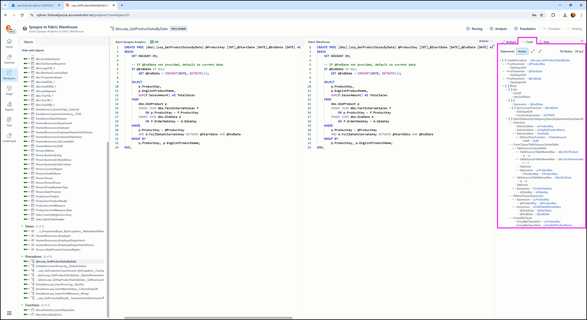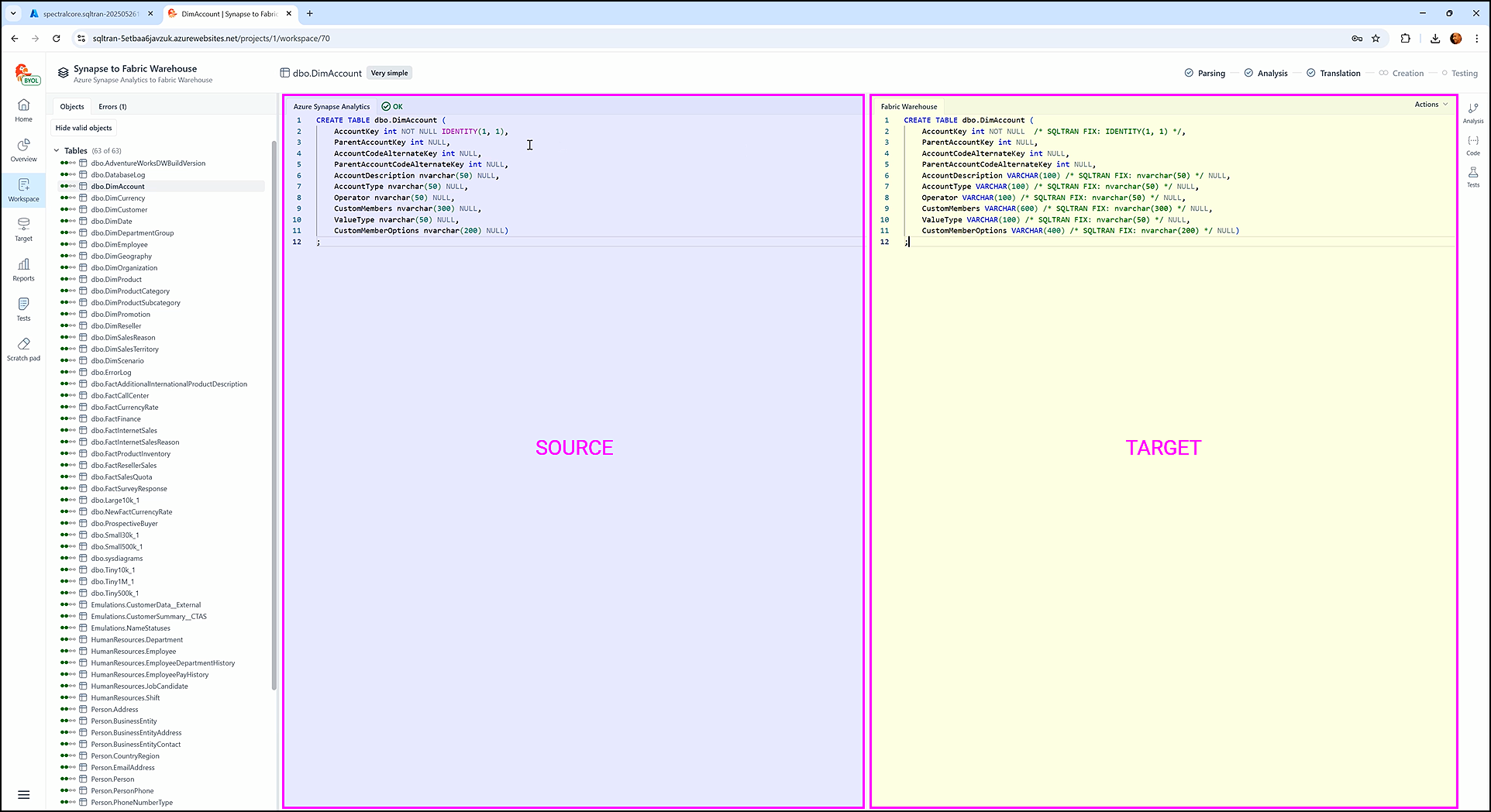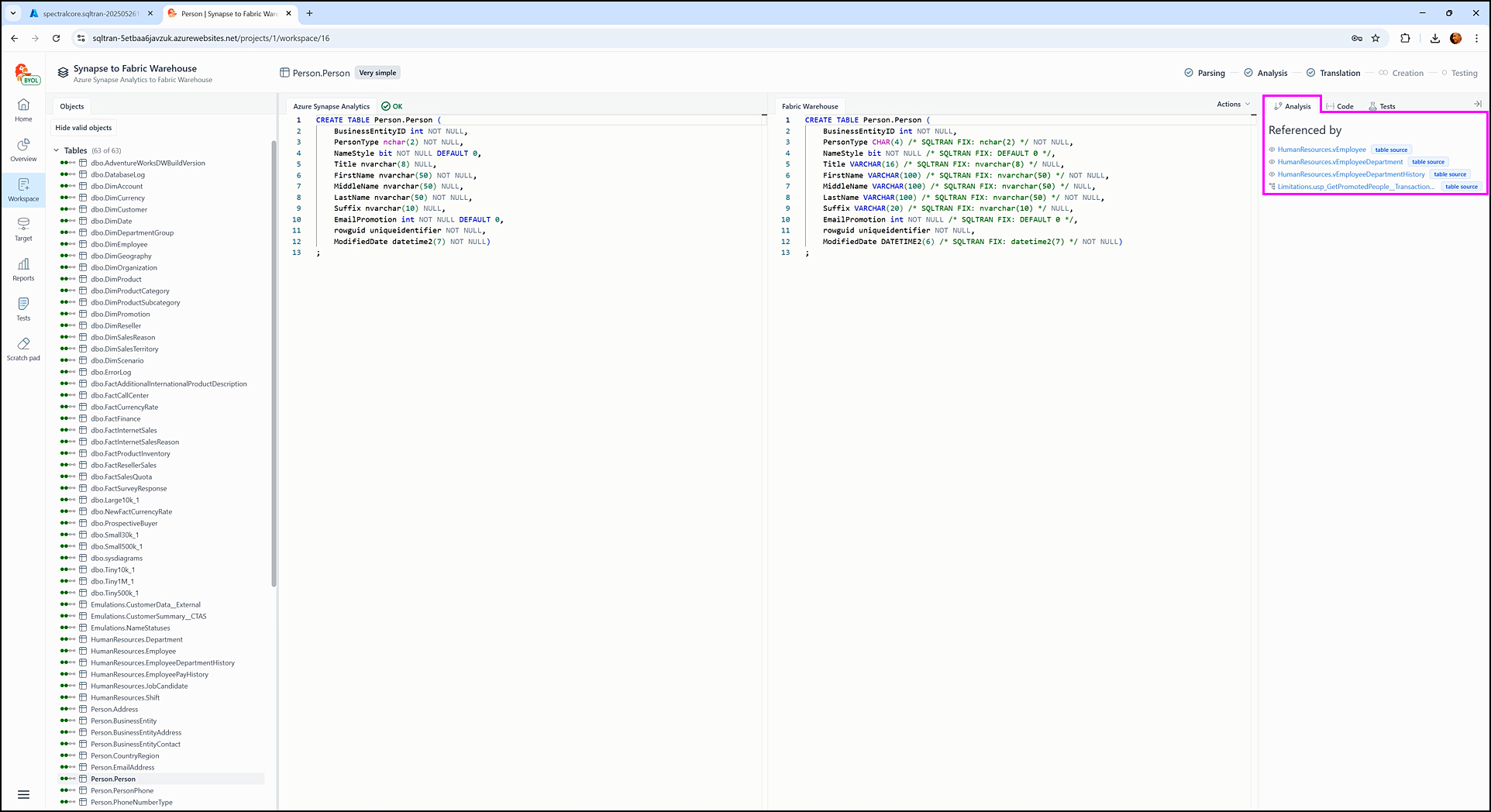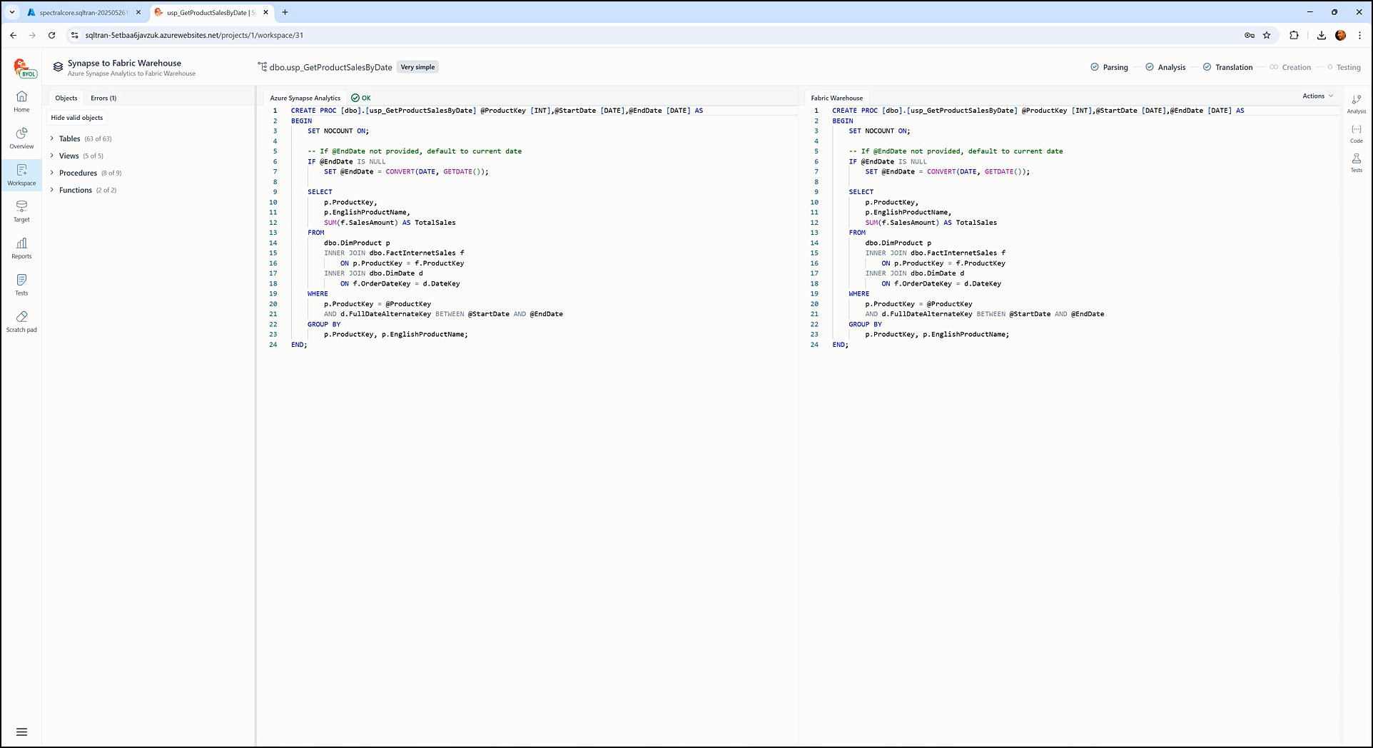 Azure Synapse Analytics) in the source pane. - The translated SQL code for the target system (e.g.,