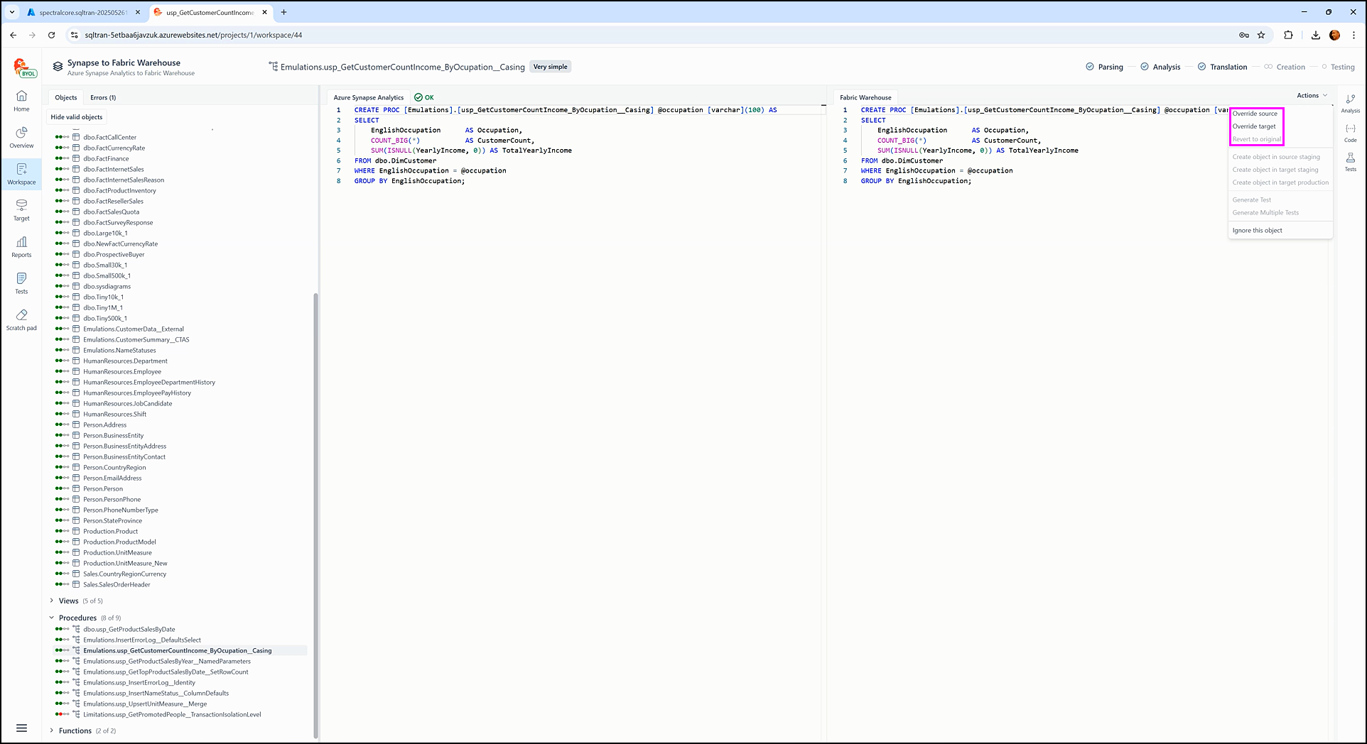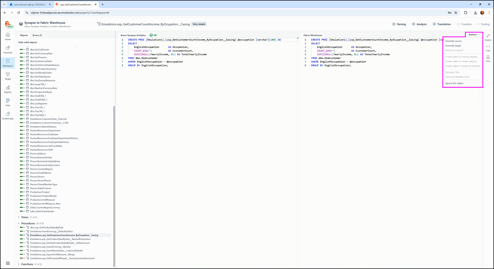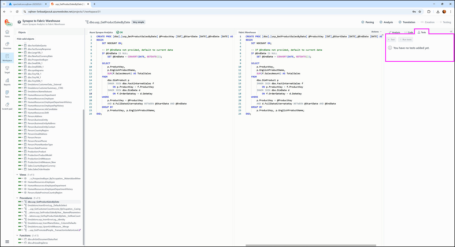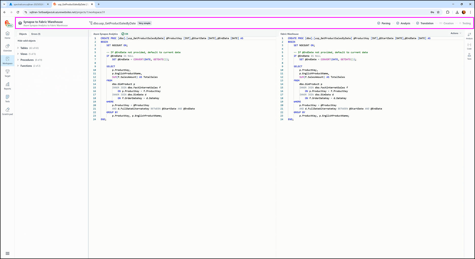 Azure Synapse Analytics) in the source pane. - The translated SQL code for the target system (e.g.,