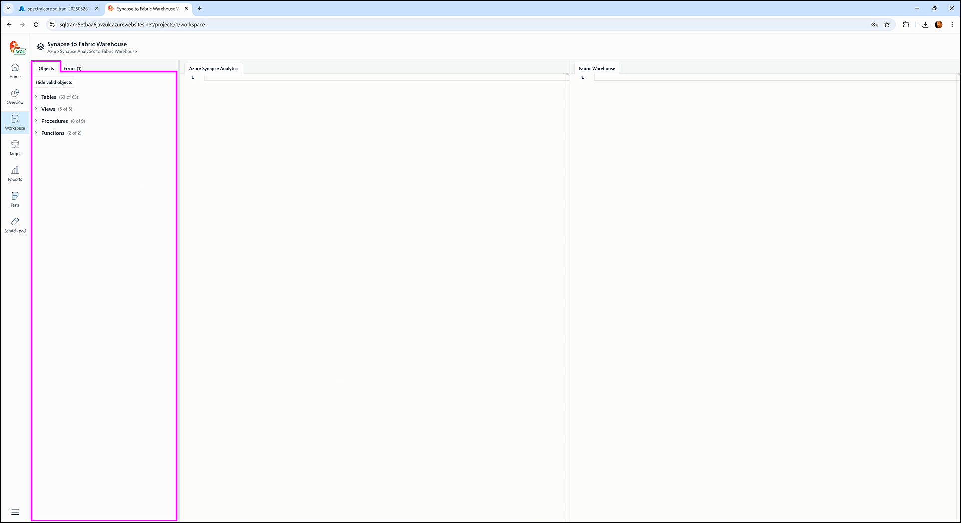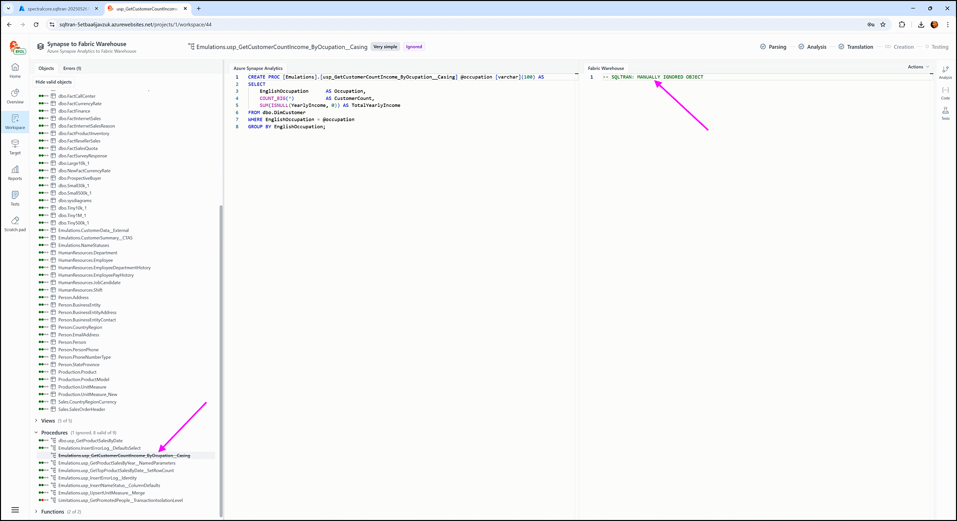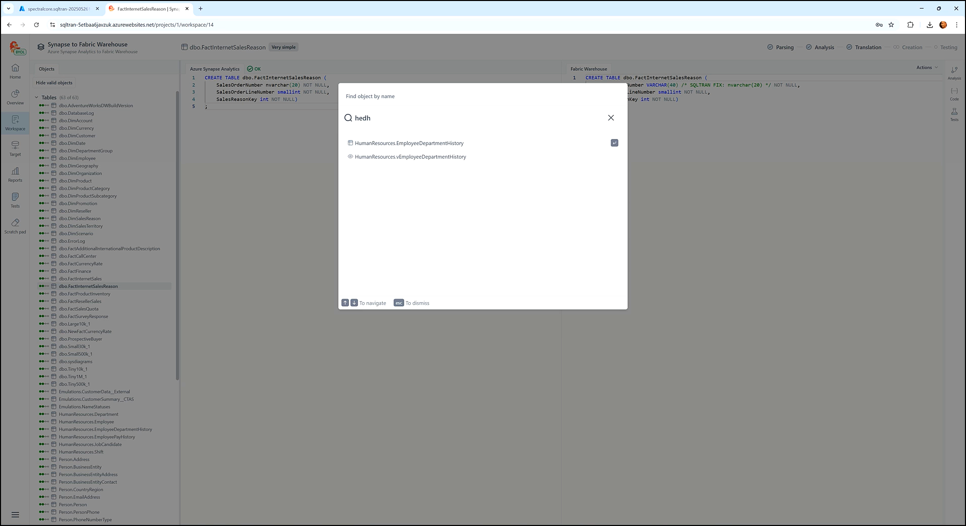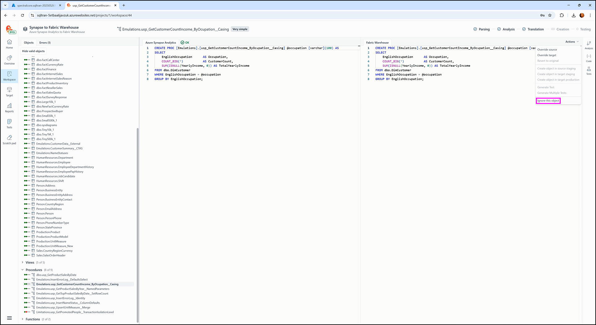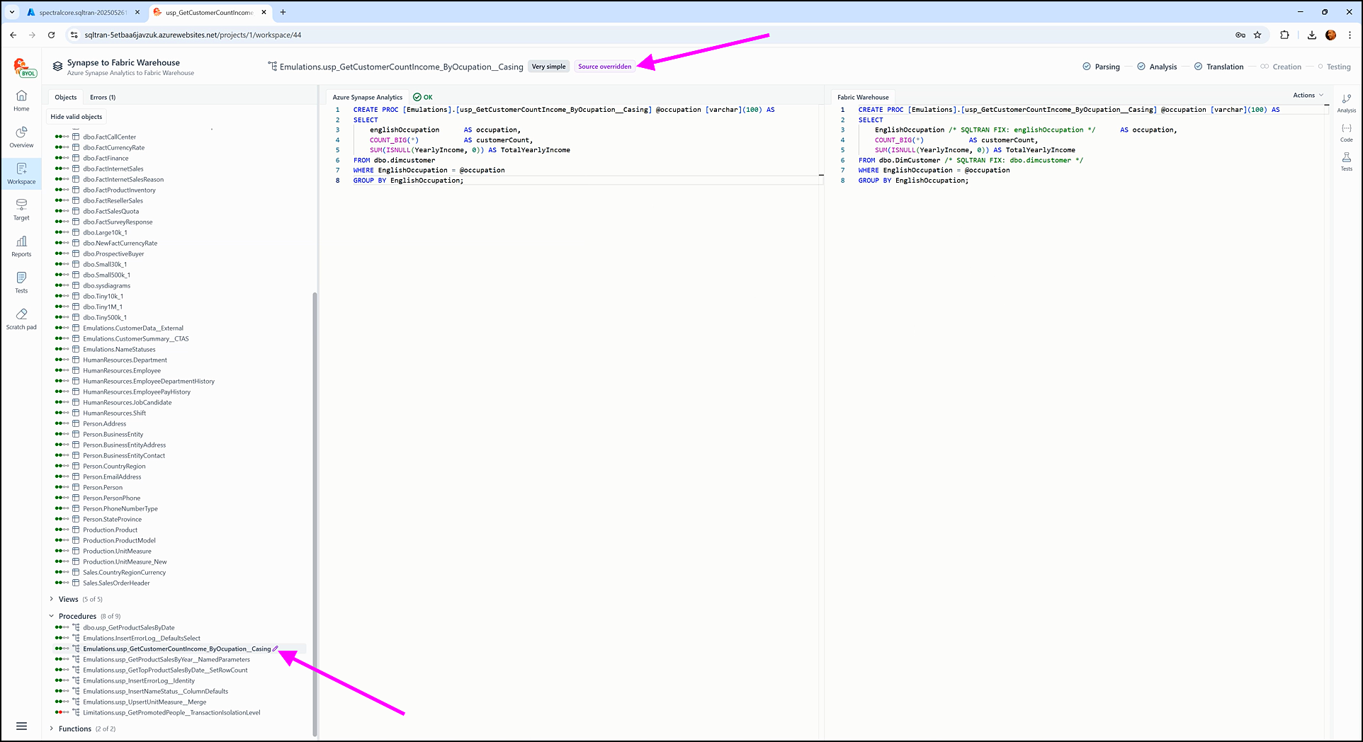 Azure Synapse Analytics) in the source pane. - The translated SQL code for the target system (e.g.,