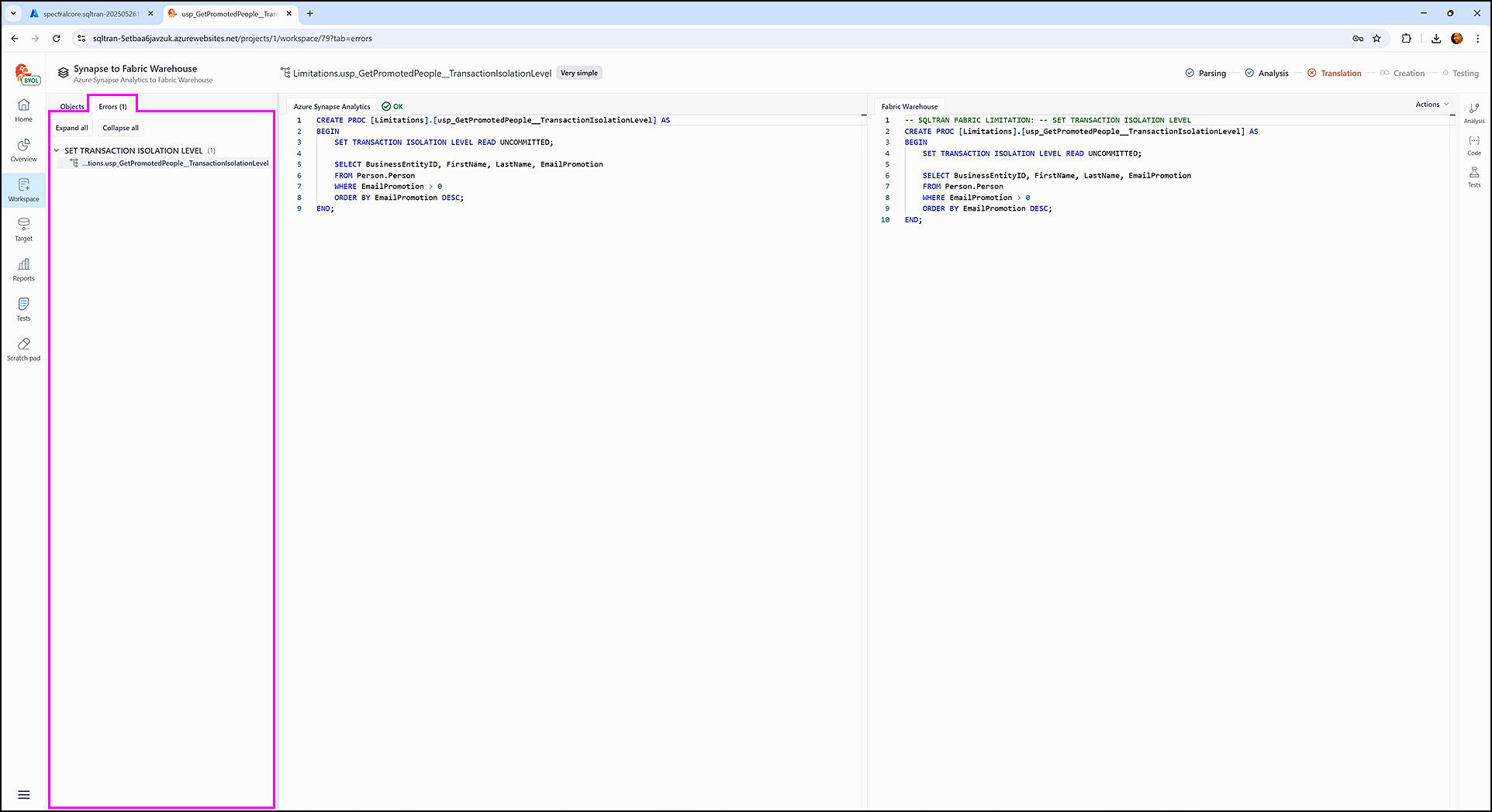 Next to the Objects tab is the Errors tab, which is only visible if errors or limitations were detected during translation.