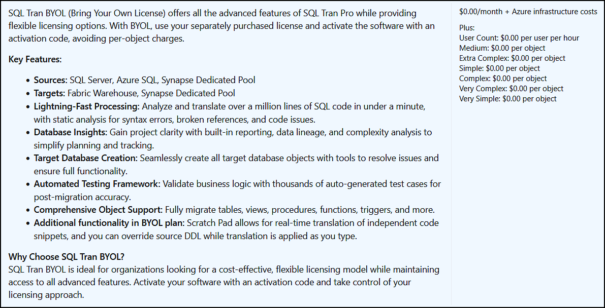 Each plan is designed to fit different usage patterns and organizational needs. In this guide, we will focus on the SQL Tran BYOL plan, as it is the recommended choice for Microsoft partners.