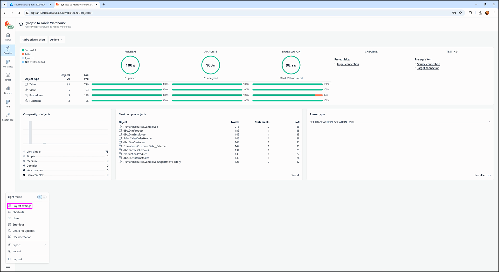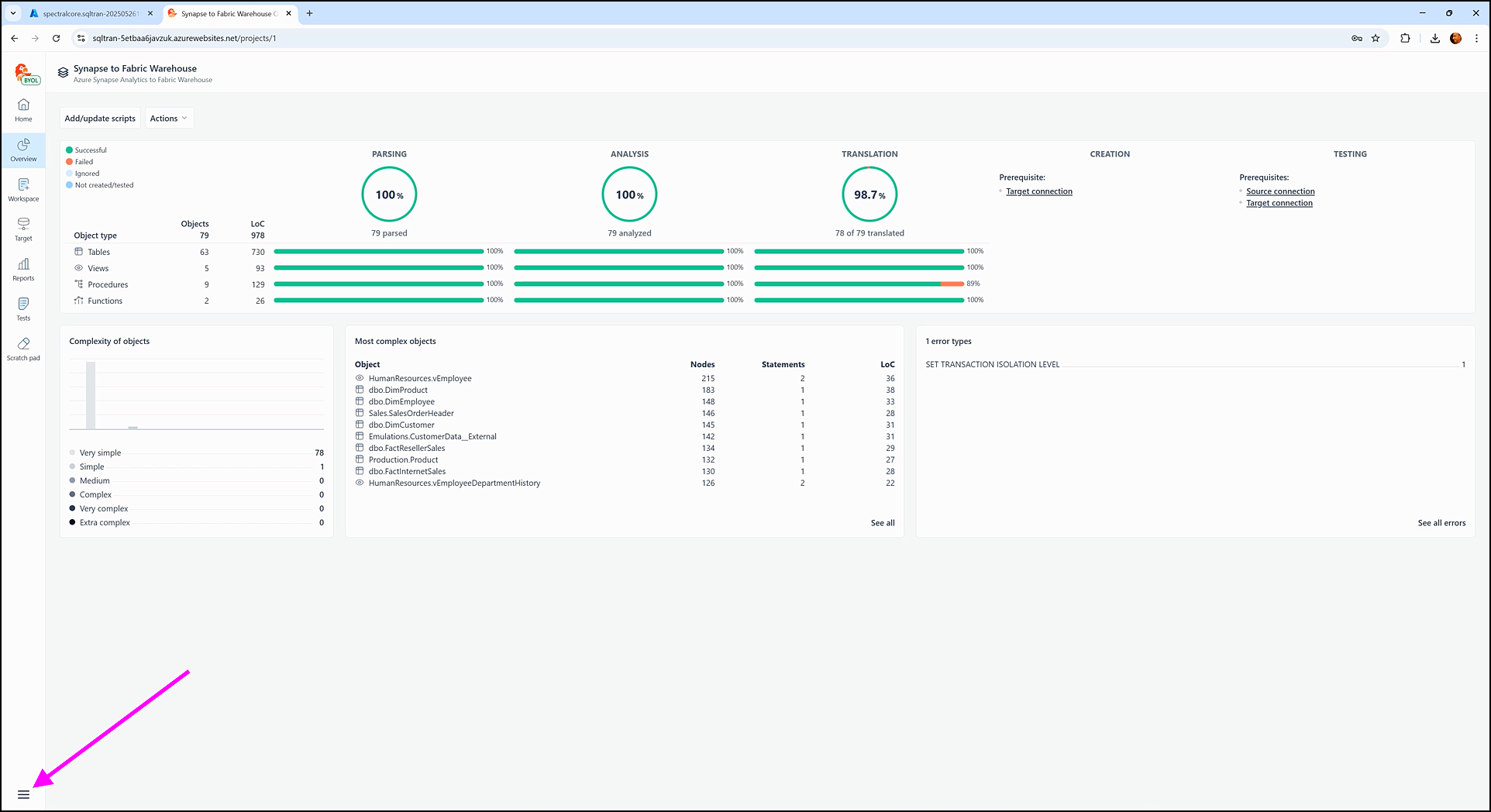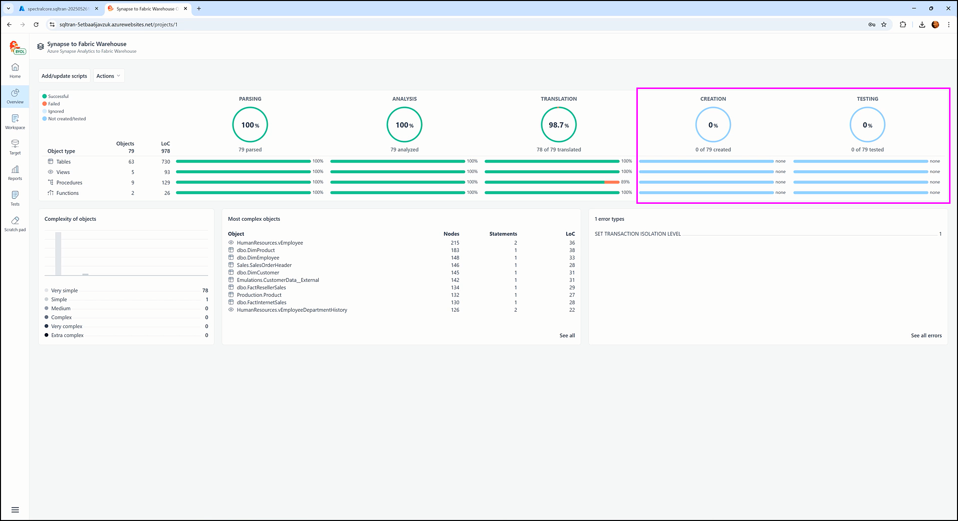 With both source staging and target staging connections successfully configured, SQL Tran enables the Creation and Testing stages of the object lifecycle. These features are now unlocked and accessible through relevant sections of the Overview, Workspace, and Tests screens.