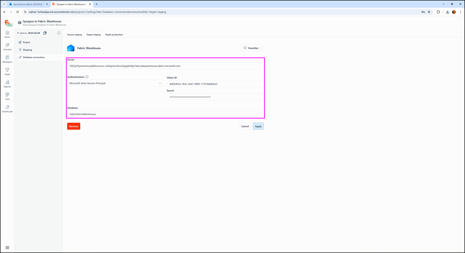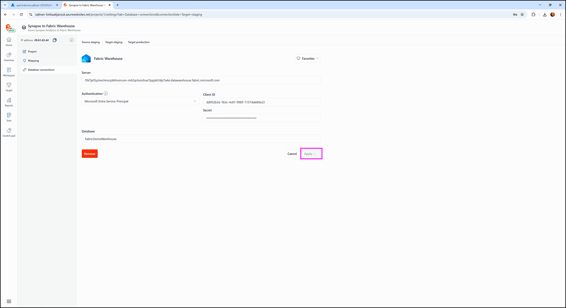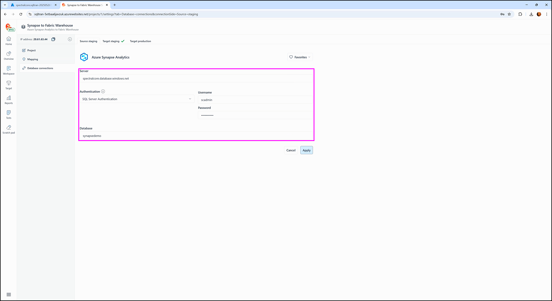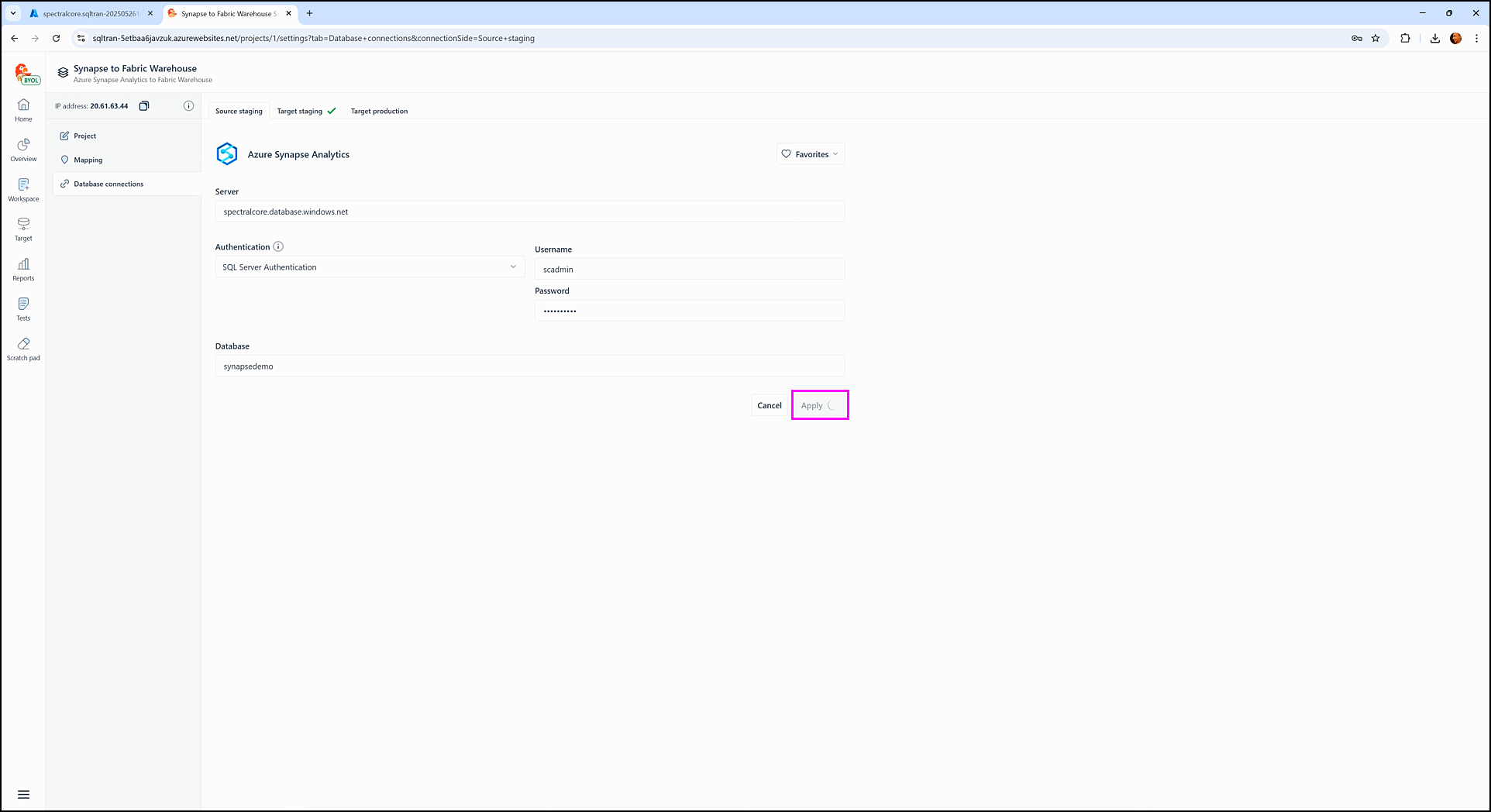 6. Enter the target staging connection details