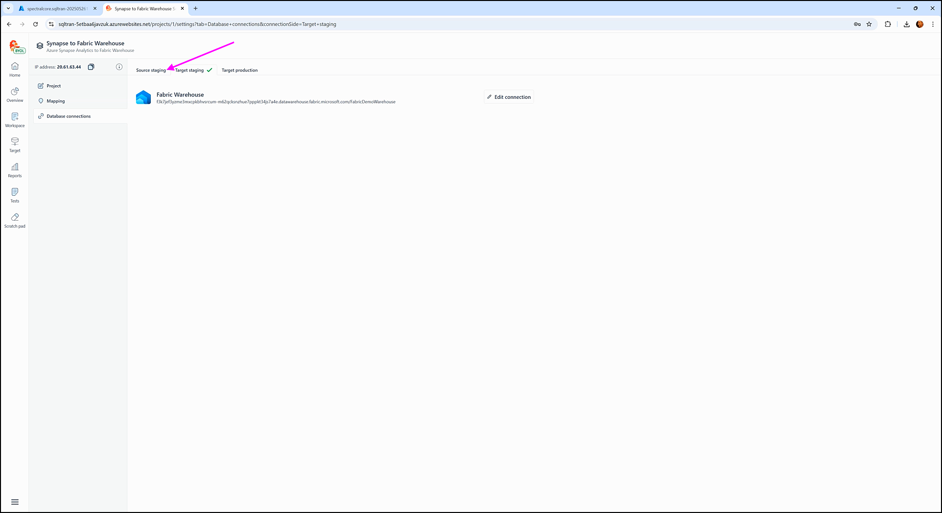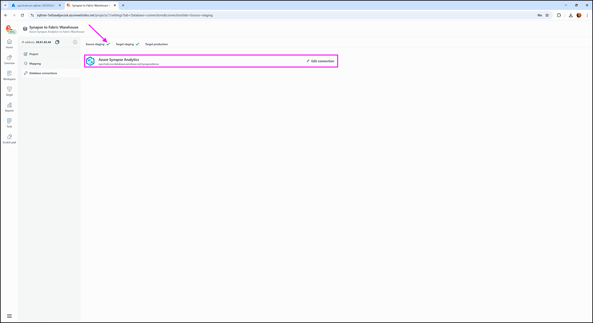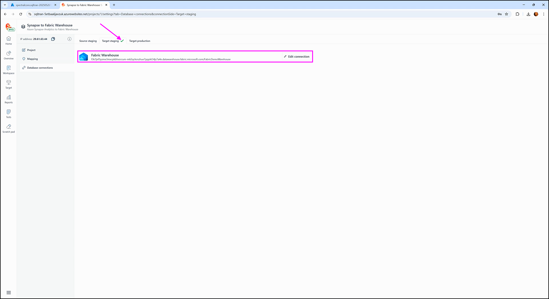 Once the connection is successful, the UI will update to display the connection name and an Edit connection button. A green checkmark will also appear next to the Target staging tab (e.g., Target staging ✔).