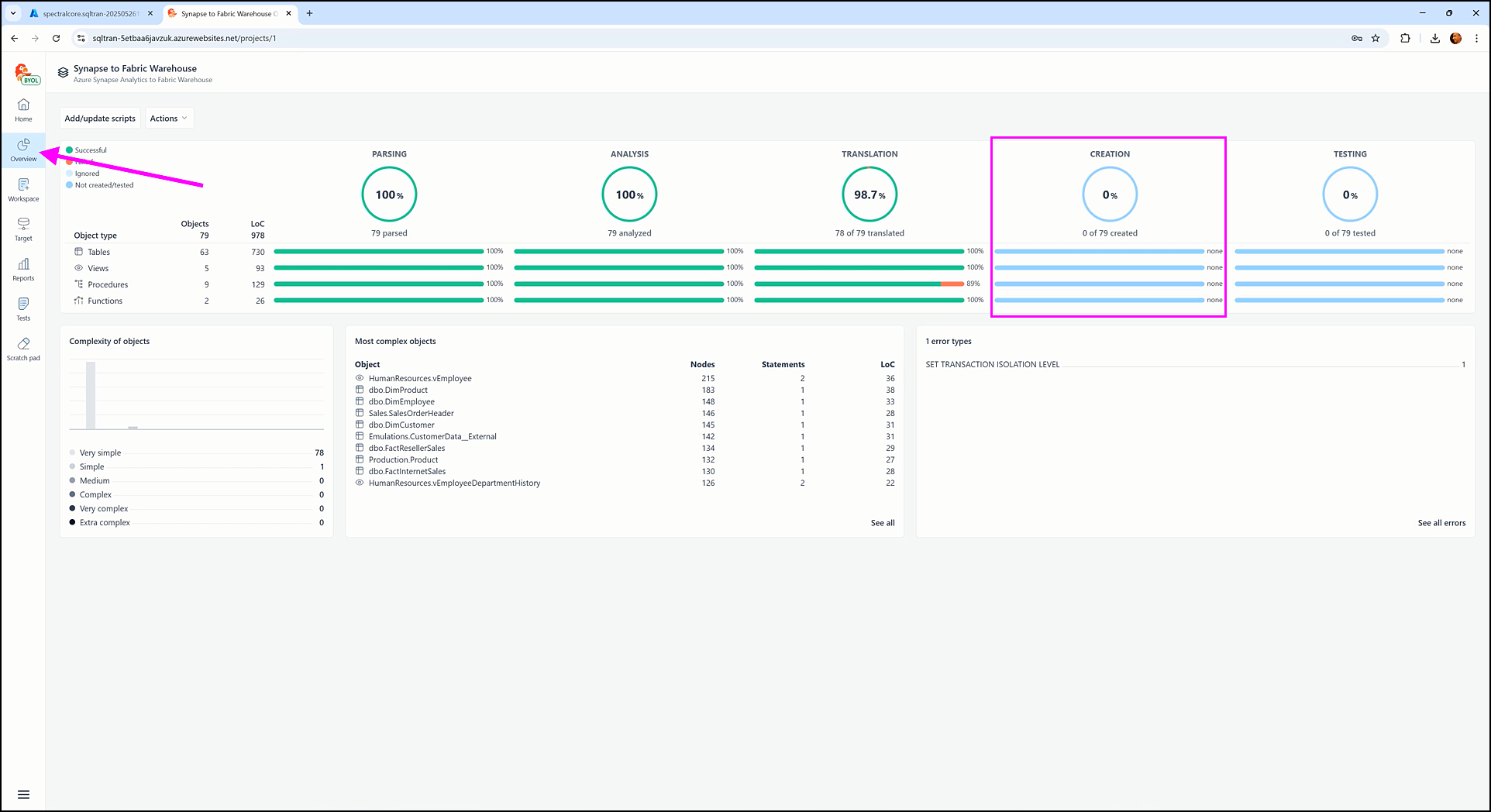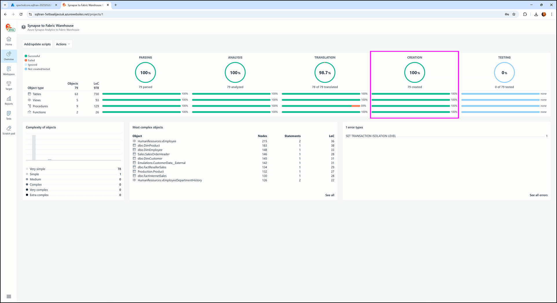 After completing the schema creation process, the Creation stage in the Overview screen reflects the updated state of the target staging database.