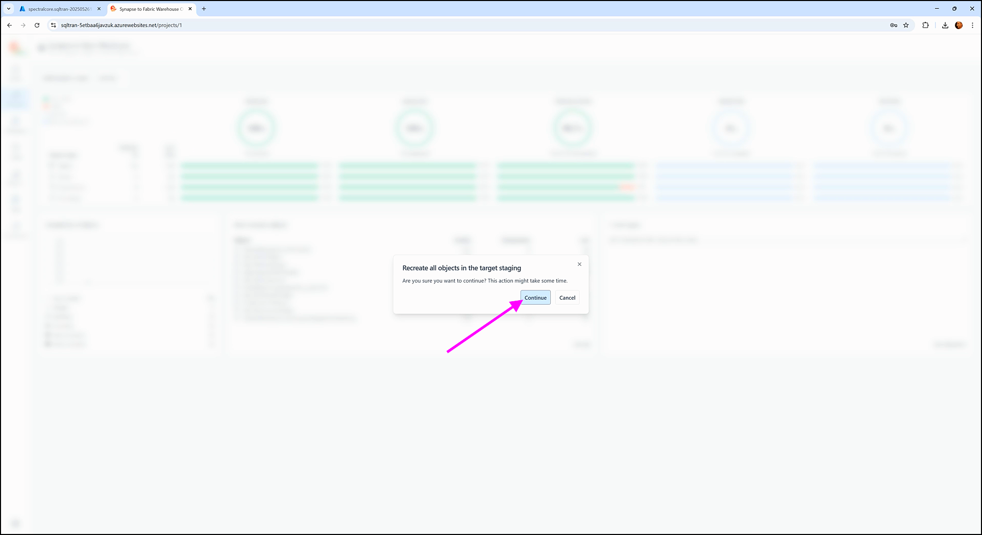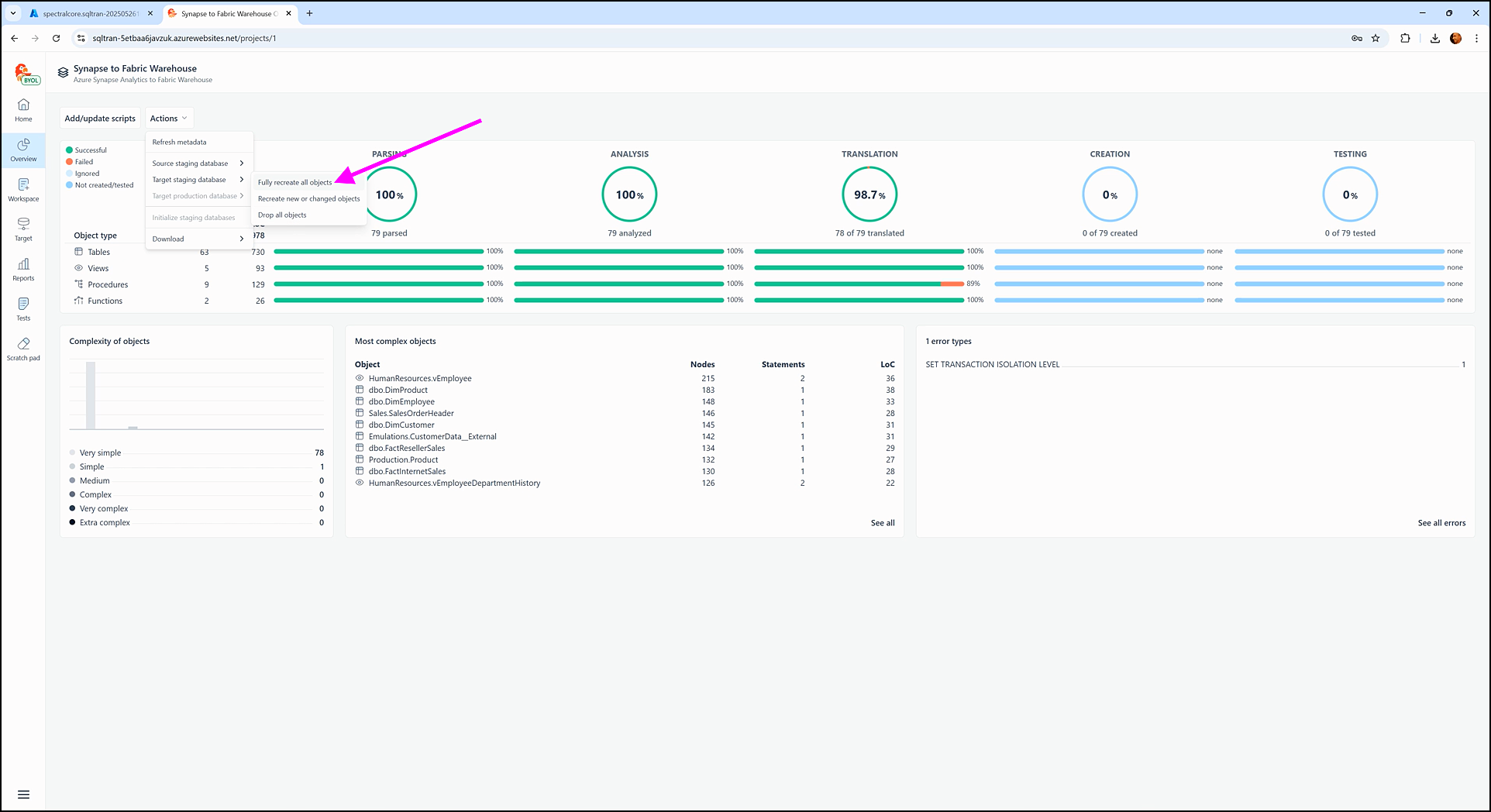 From the Actions menu, under the Target staging database section, select Fully recreate all objects.