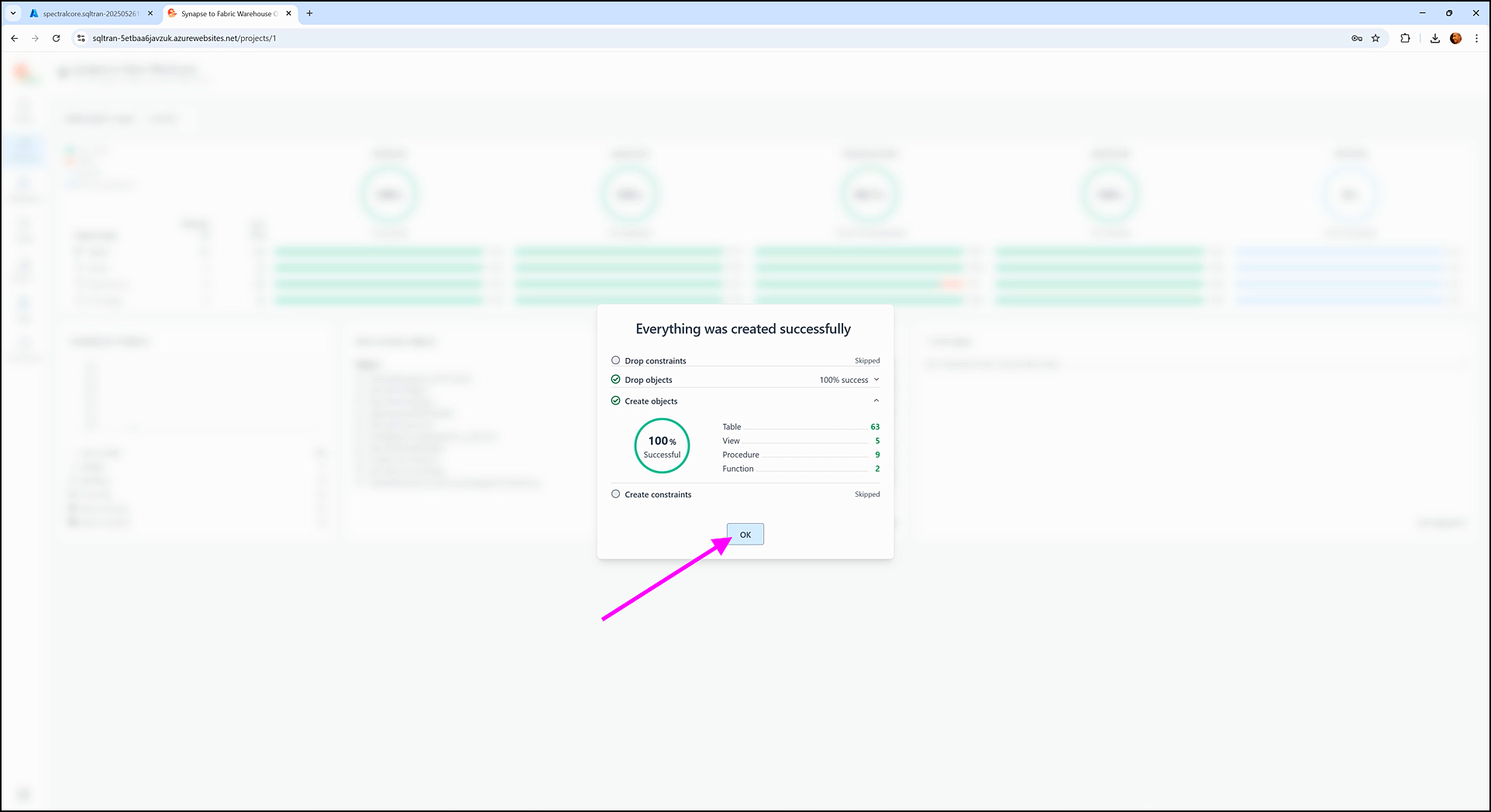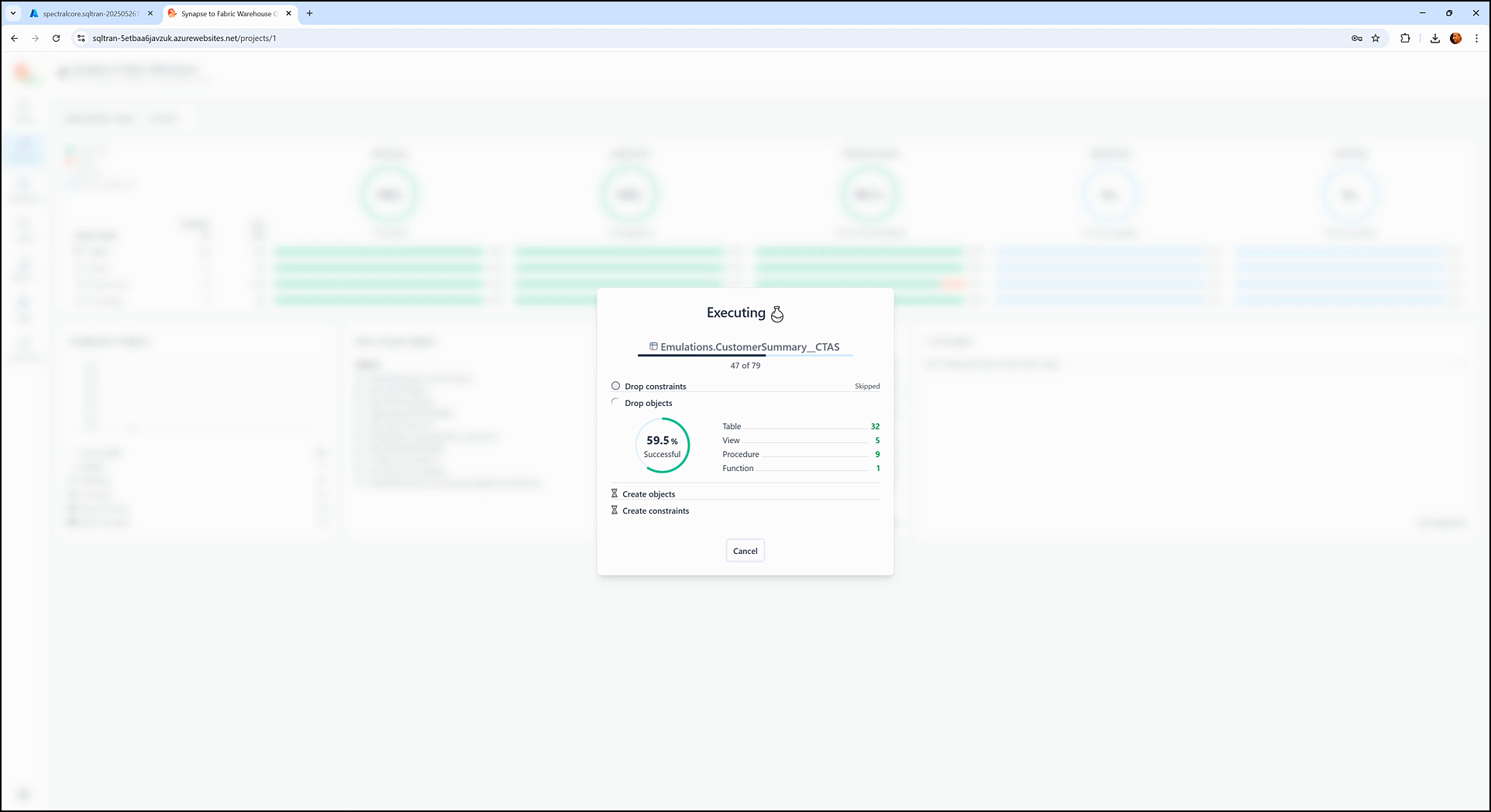 The circular overall progress indicator now displays the percentage of project objects successfully created, along with a numerical summary beneath it. Progress bars now reflect completion percentages for each object type.