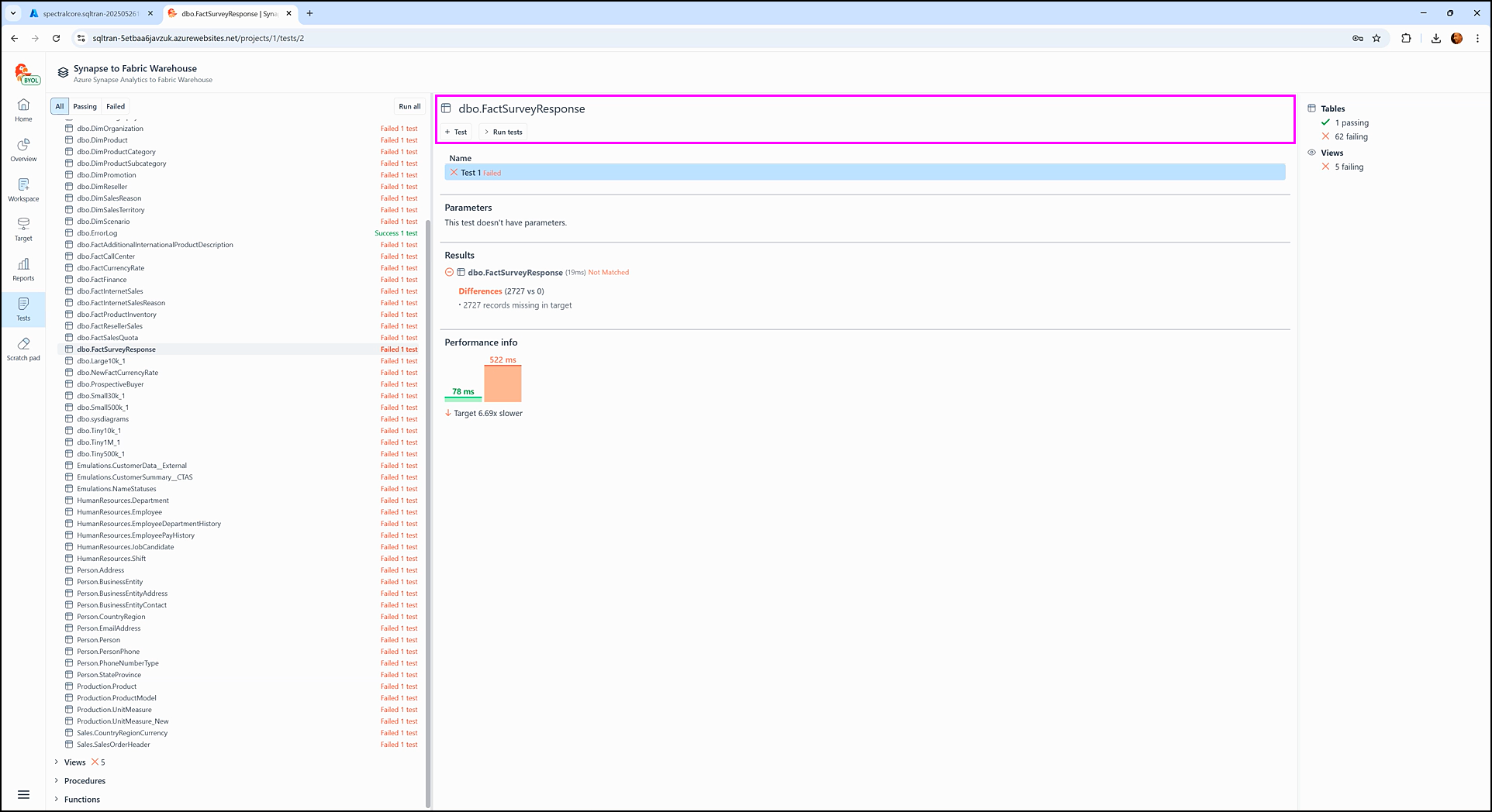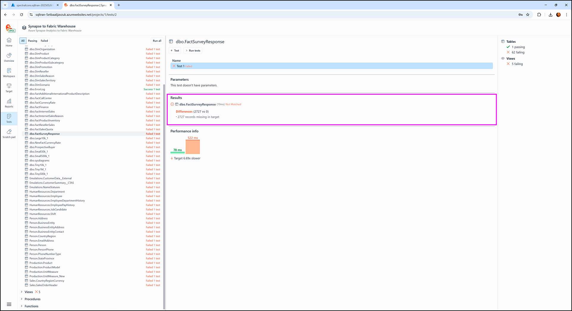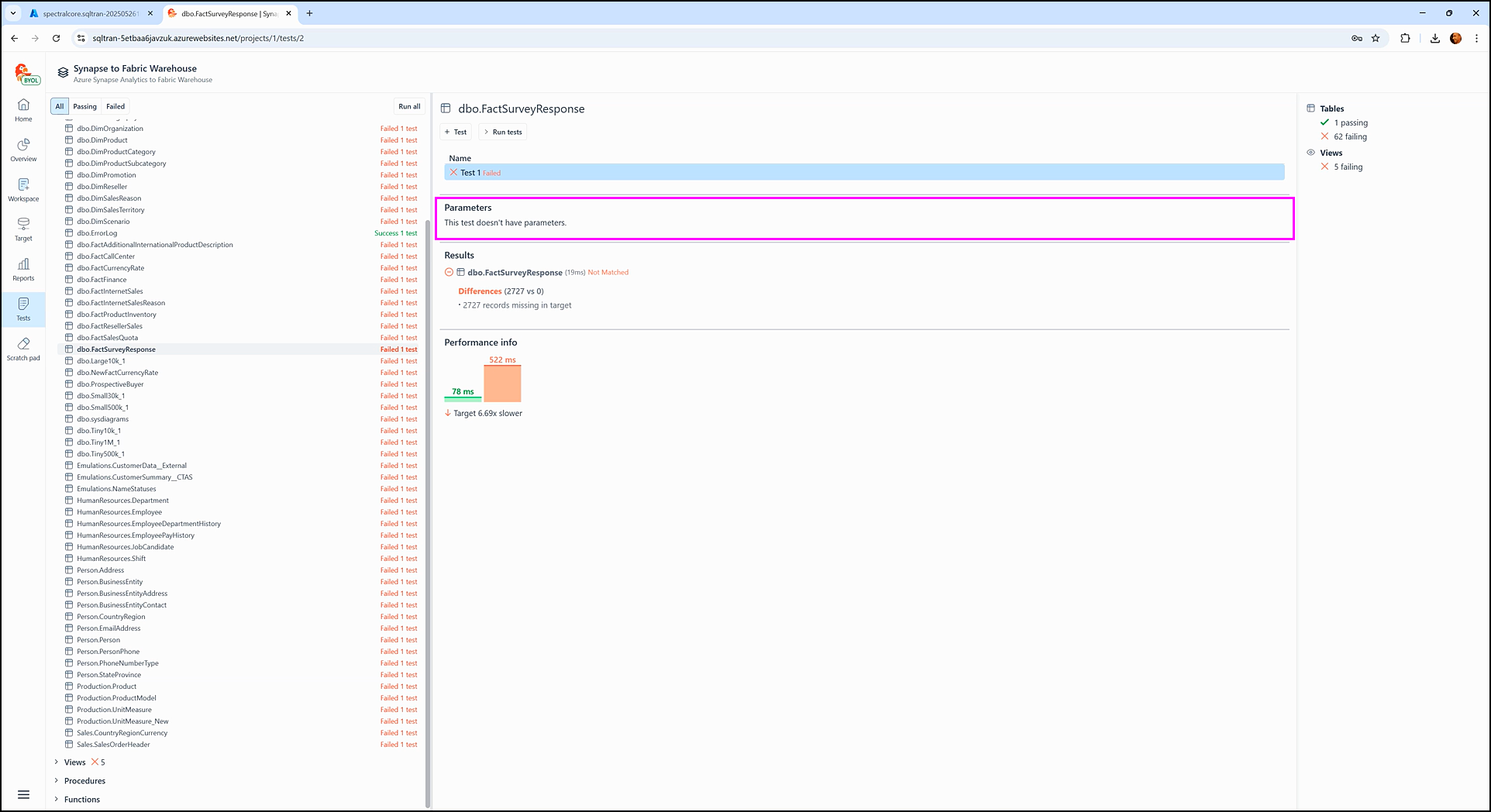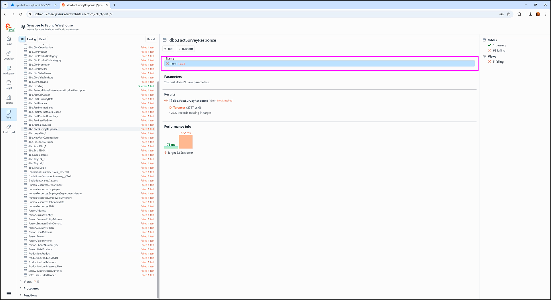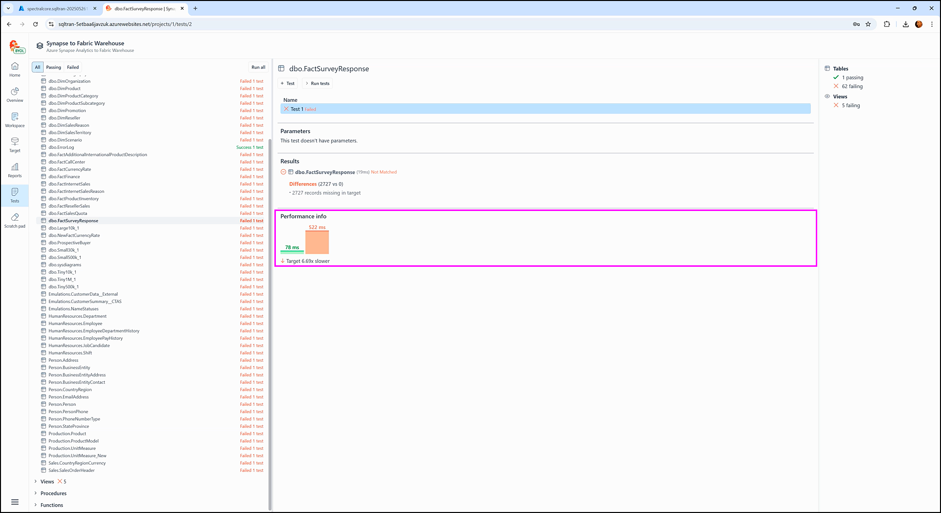 The Performance info section displays how long it took SQL Tran to fetch data during the test execution from each staging database: