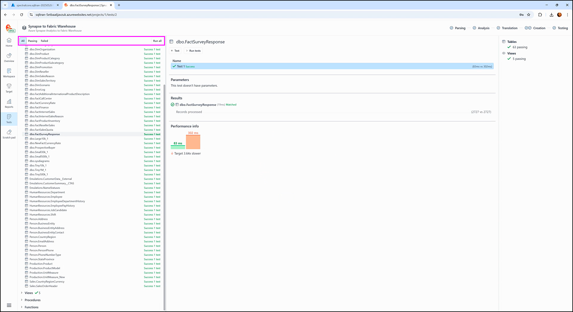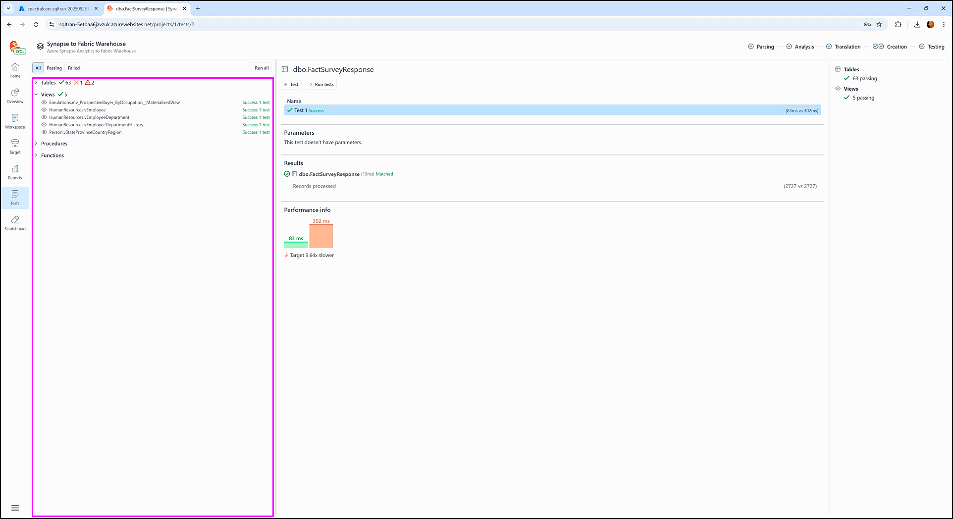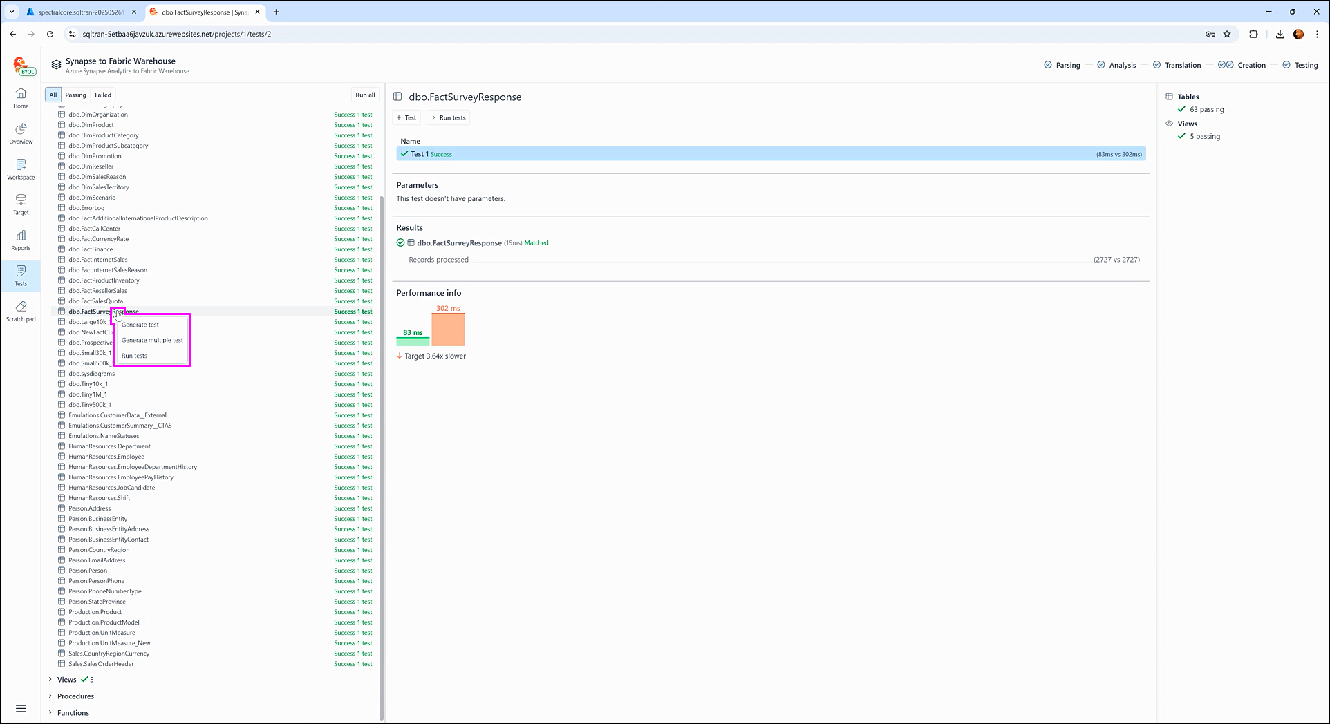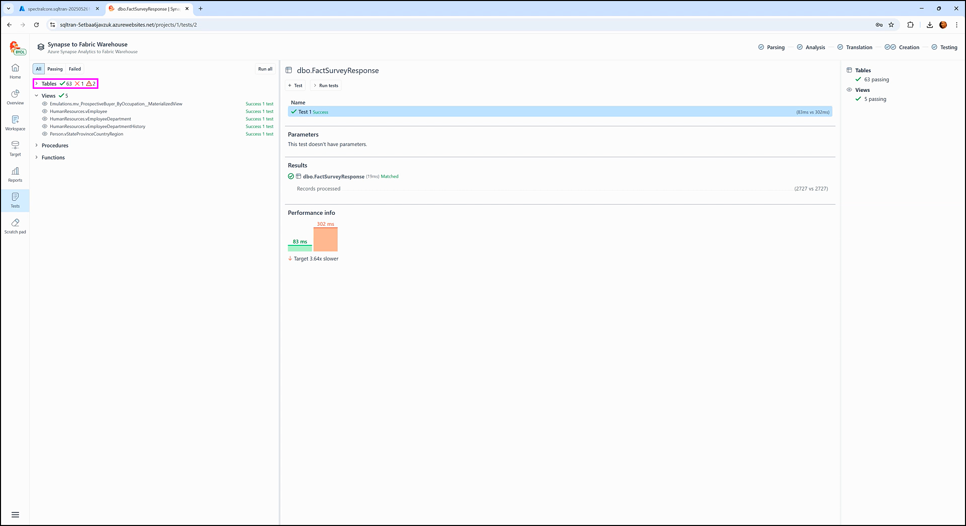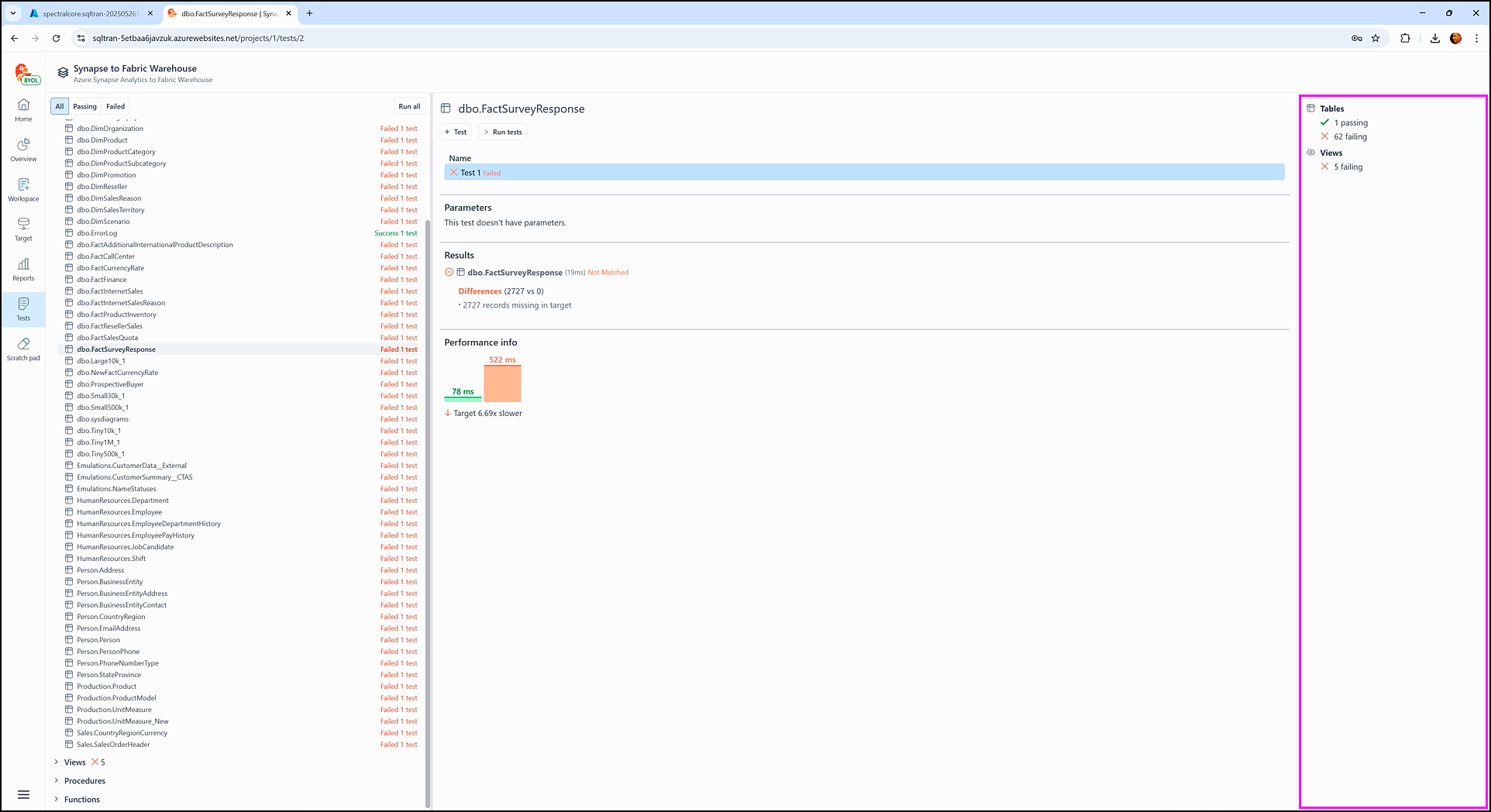 The Performance info section displays how long it took SQL Tran to fetch data during the test execution from each staging database: