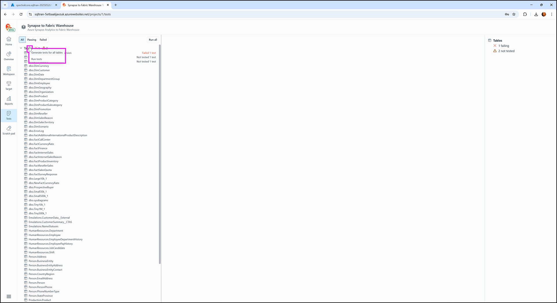 Generate tests for all tables/views– Attempts to create a test for every object in the selected group. This option is available only for tables and views. If test generation is not possible, SQL Tran displays a clear error message explaining the reason.Run tests– Executes all existing tests for objects within the group. This option is enabled only when tests have already been created.