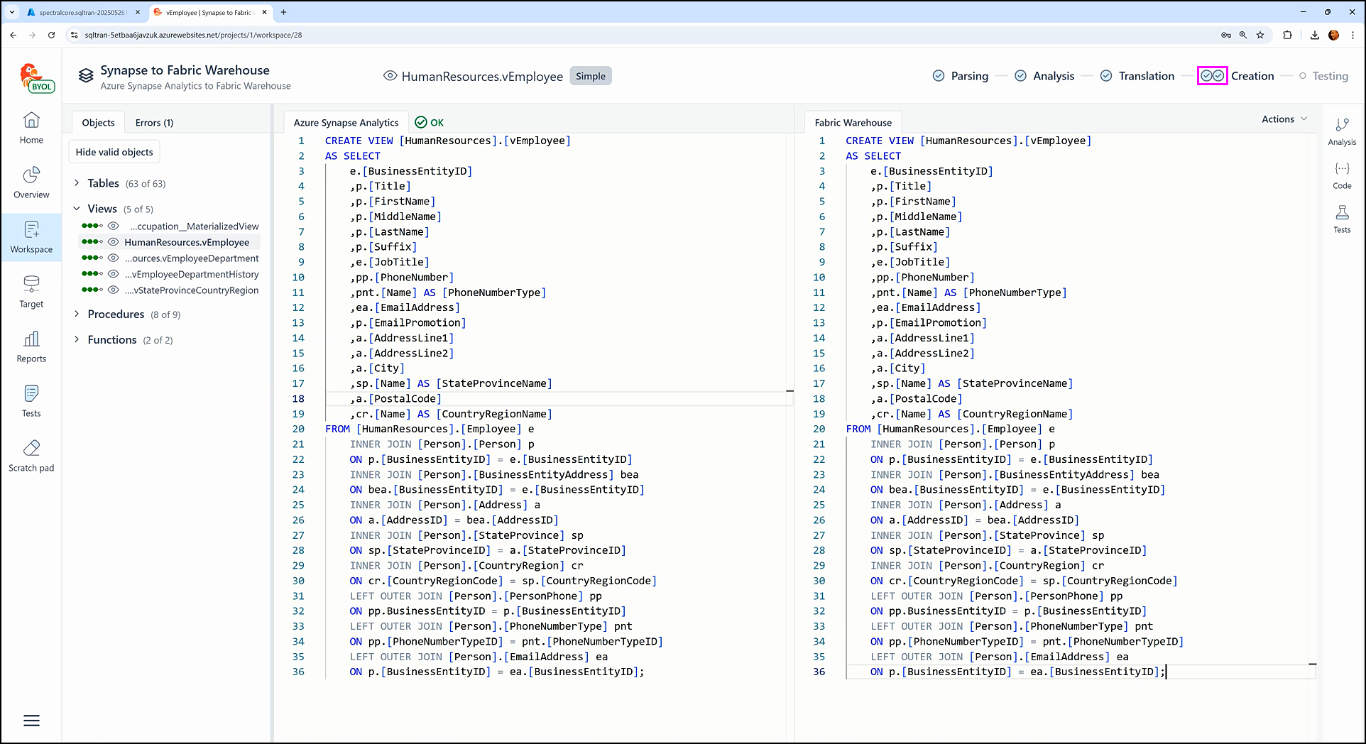 You can also hover over the Creation stage in the header pane to display a tooltip confirming the object’s presence in the source and target databases.