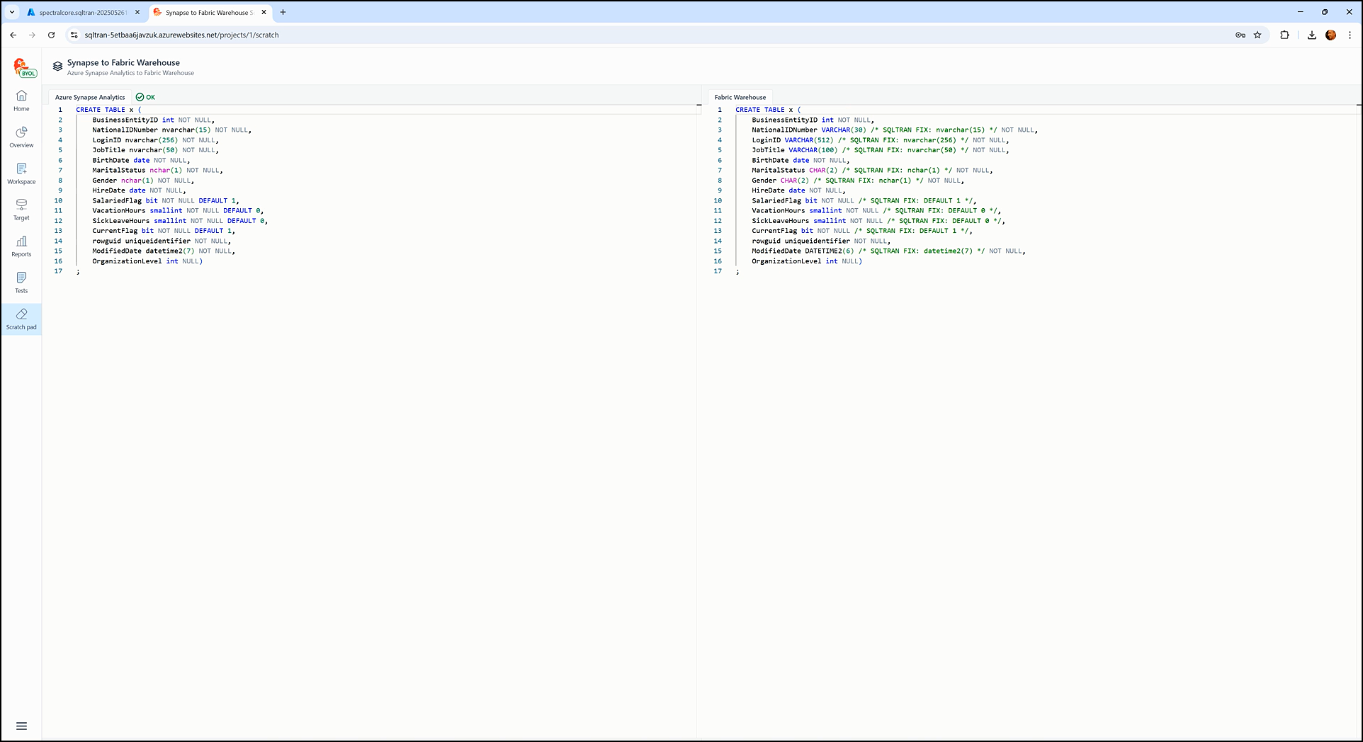 When you enter code in the source editor in the Scratch pad (source pane), SQL Tran immediately translates it into the target SQL dialect (target pane), applying all necessary transformations and emulations to ensure compatibility with the configured target environment (e.g., Microsoft Fabric Warehouse).