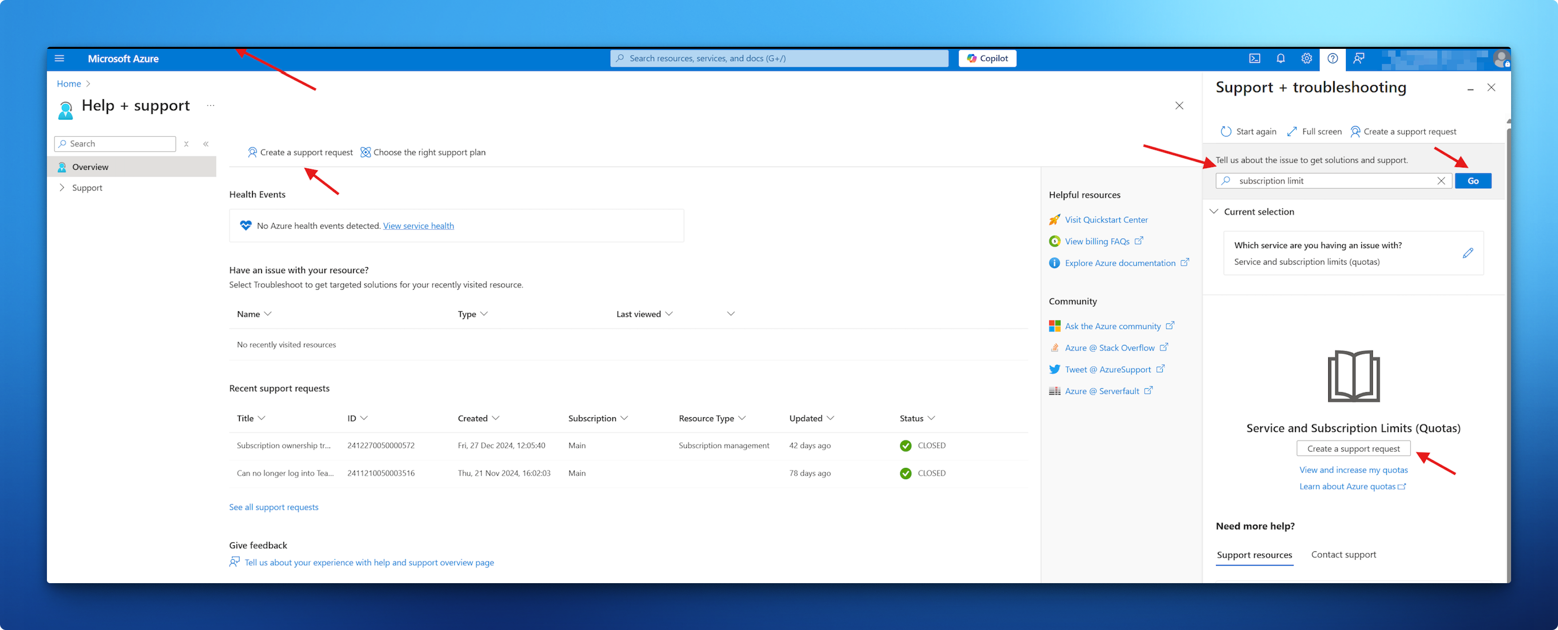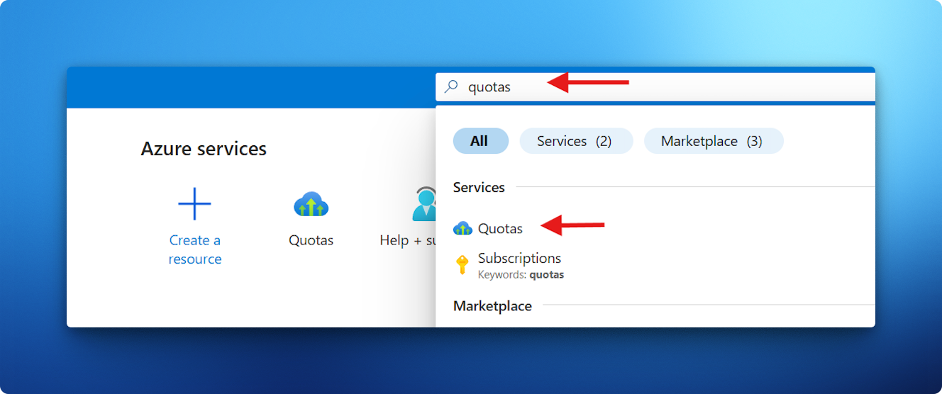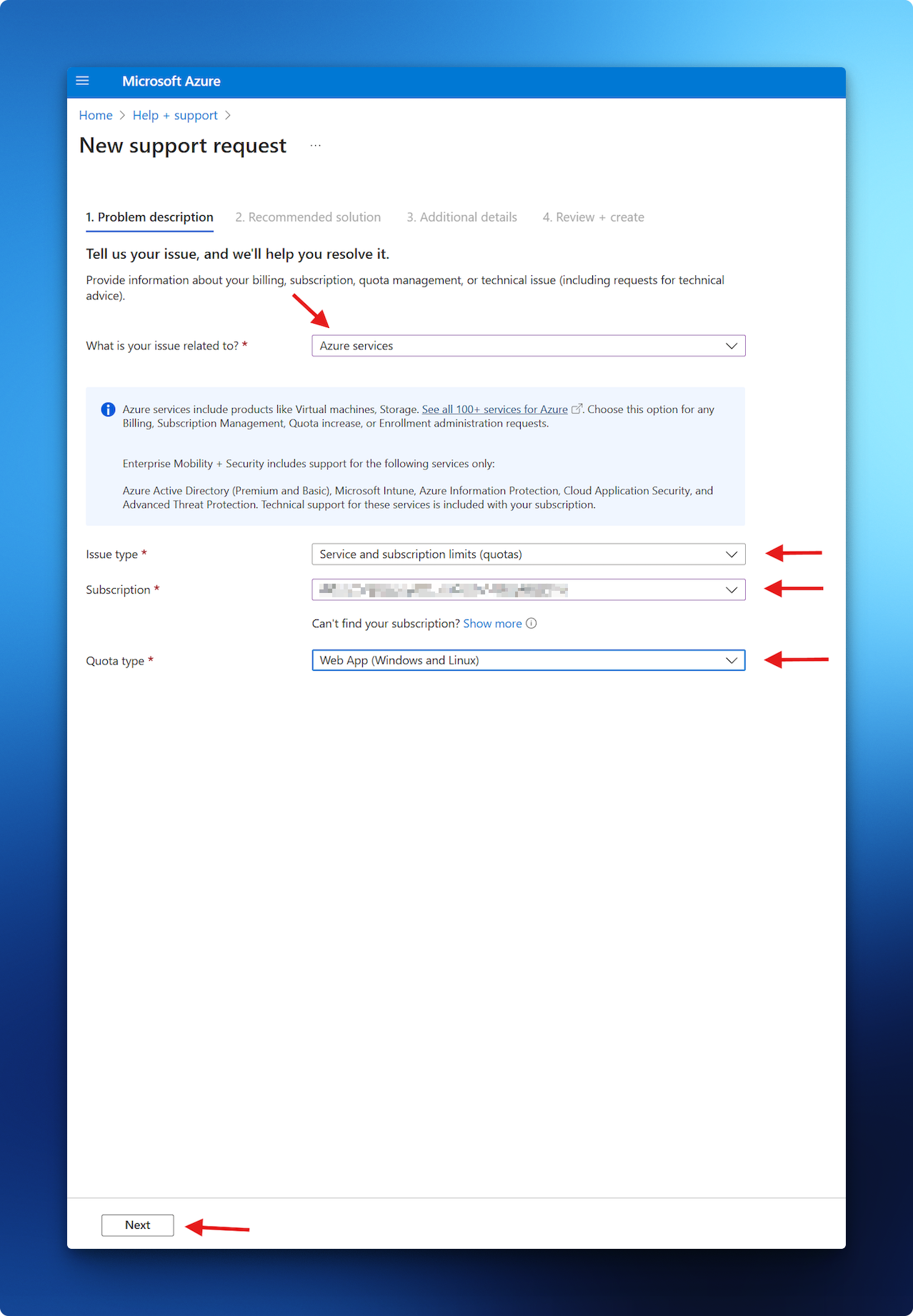 Then, pick Azure services, Service and subscription limits (quotas), select the desired subscription, and choose the "Web app" quota type.