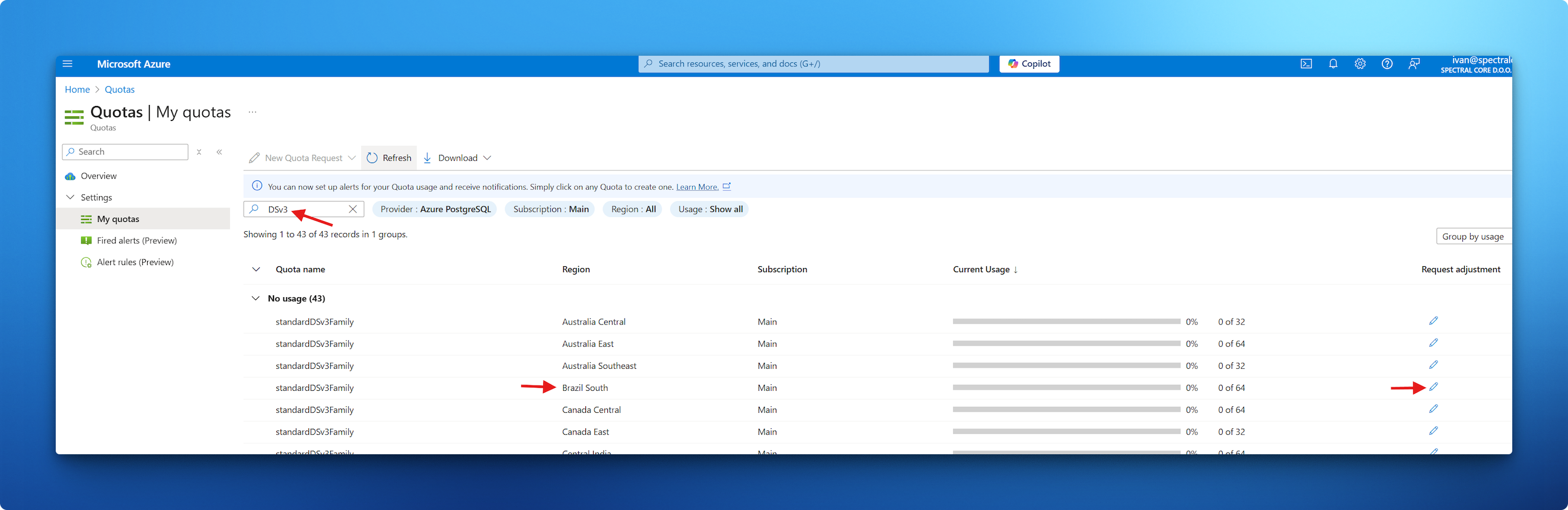 We need a "Standard_D2s_v3" instance, so let's search for DSv3. Once that's listed, select your region and click on the tiny pencil icon on the right end of its row to edit the region quota.