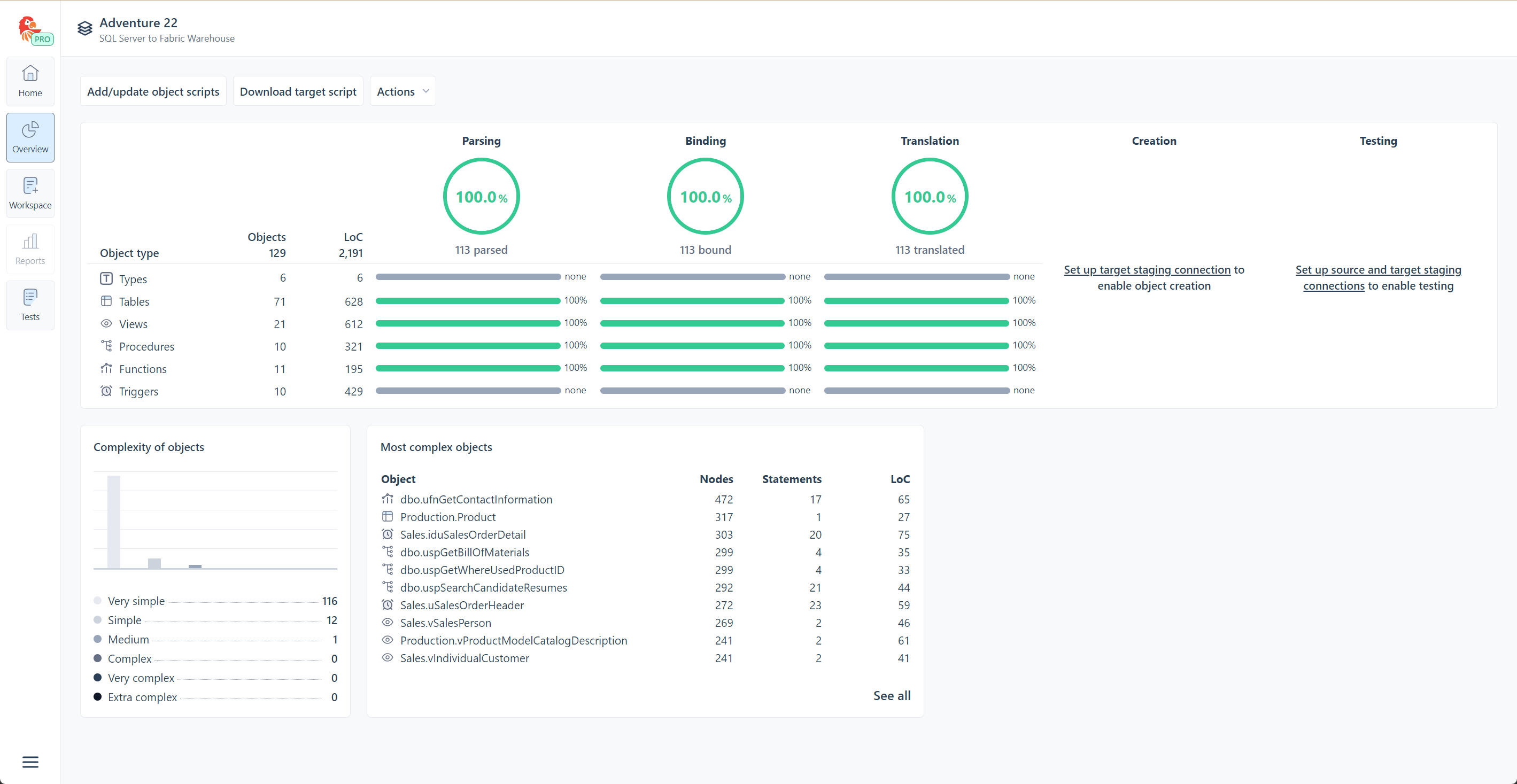 If you want to create the target objects yourself, or examine the generated script in some external tool, you can export the script here.