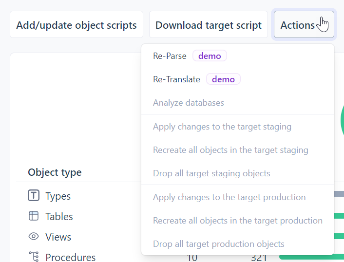 Here you can see your project stats. If SQL Tran engine has been updated since you created your project, clicking the Re-Translate button will immediately update your target code in all objects that aren't manually translated.