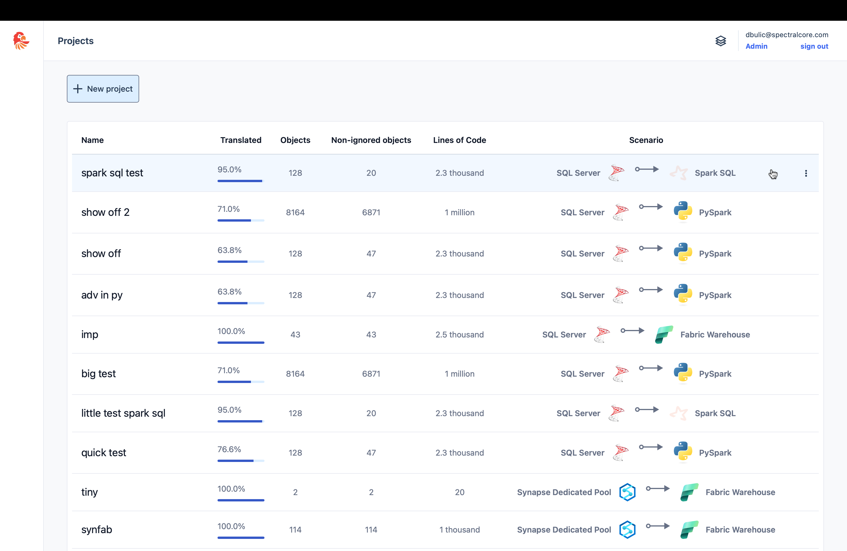 The list of projects shows some basic stats like translation percentage and lines of code, along with the scenario.