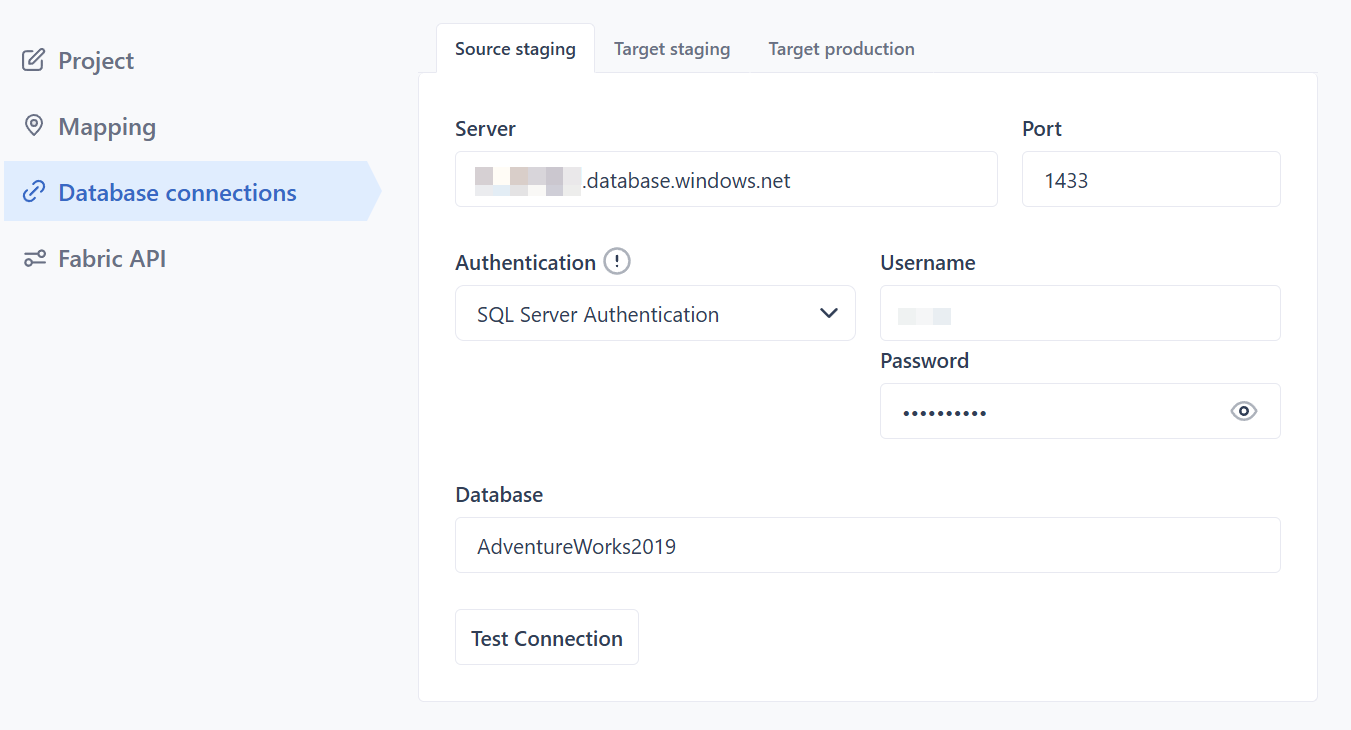 Specify your connection to the source and target staging databases to enable SQL Tran to create your target objects directly and use the testing framework.