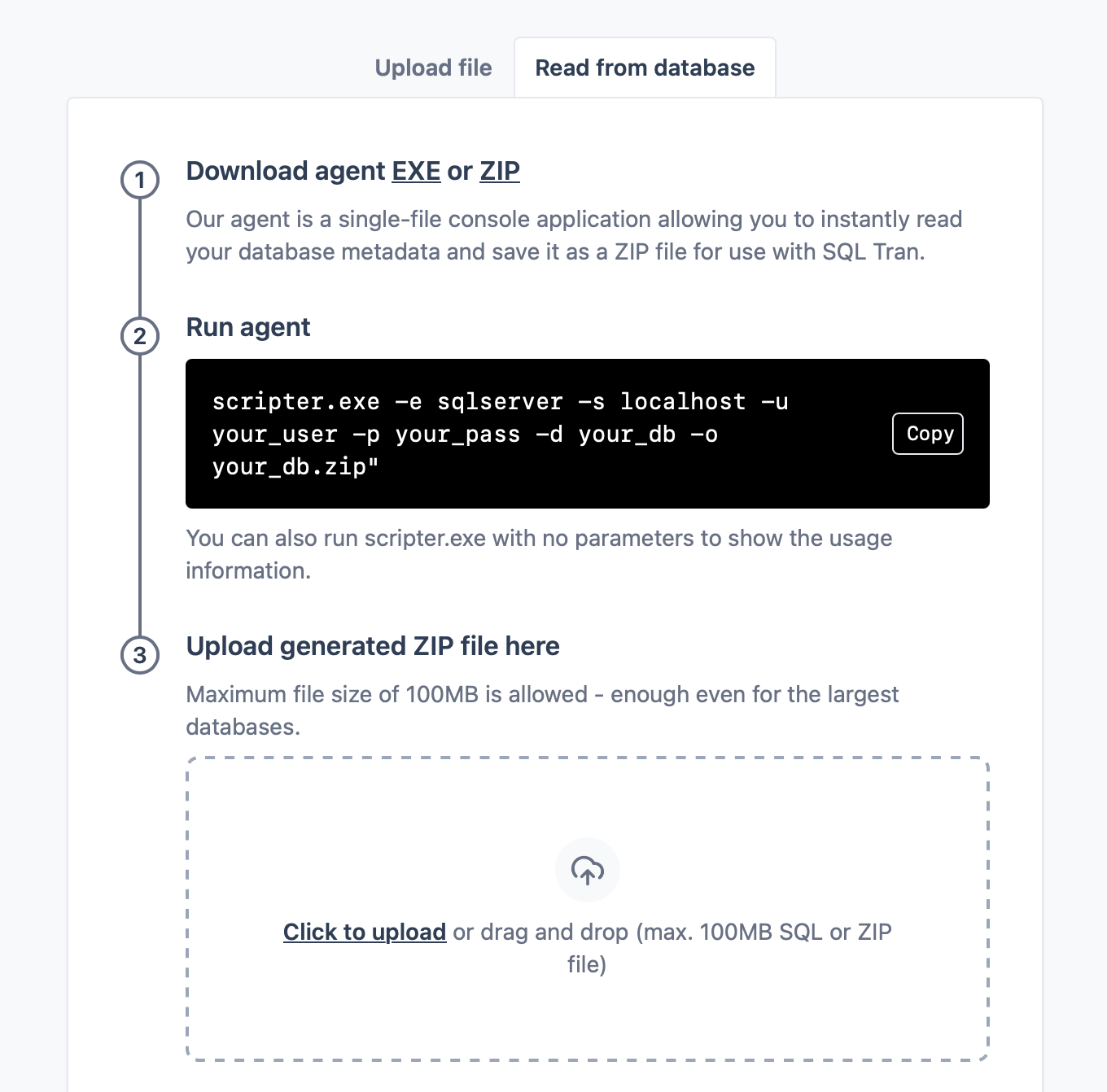 Scripter usually takes just a few seconds to script even the most complex databases. You can have it output a SQL file or a ZIP file. ZIP is recommended as it will store all objects separately which makes the import into SQL Tran more efficient and reliable.