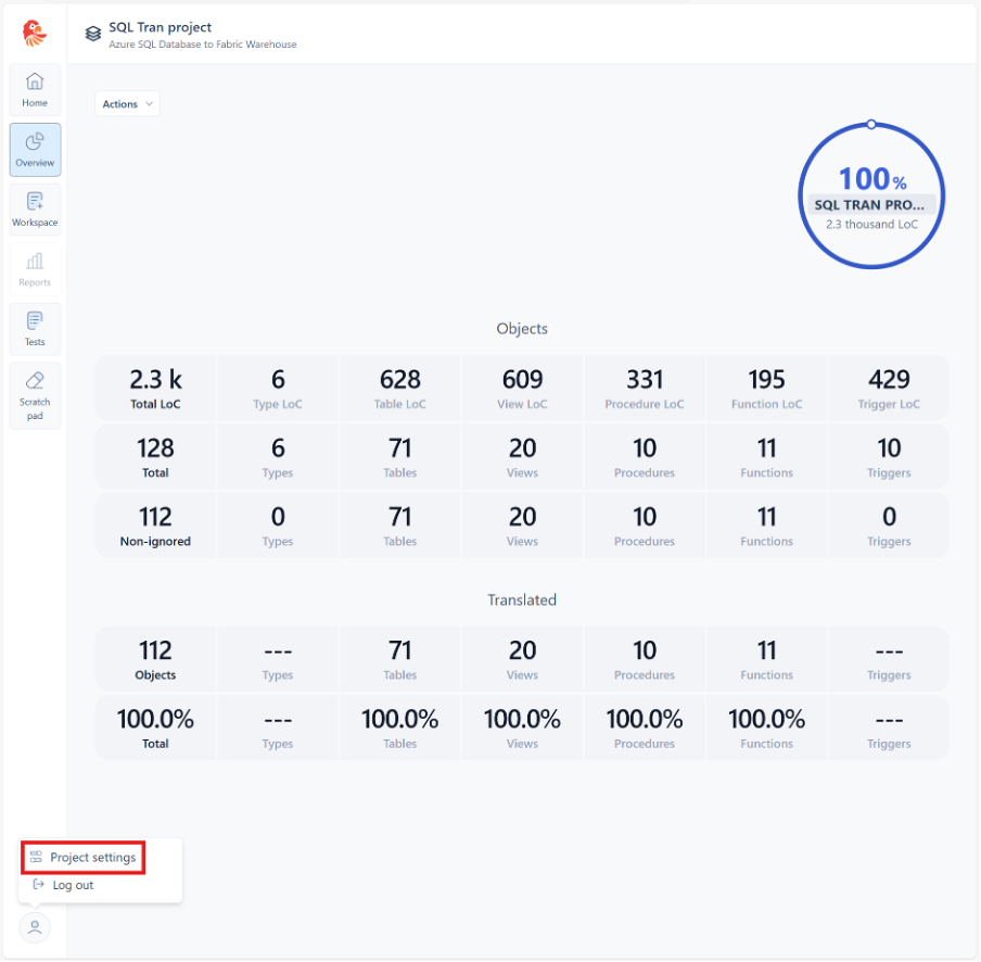 In SQL Tran, open a project. Then, in the bottom left corner click on the user icon and then click on the „Project settings“.