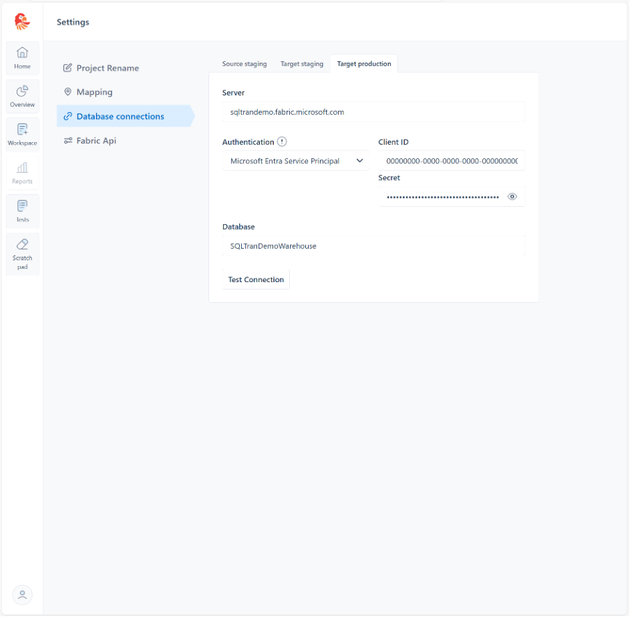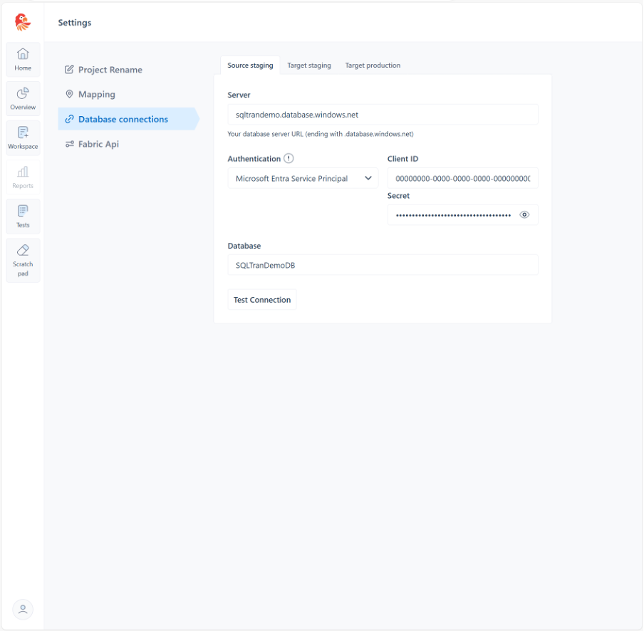 On the Settings screen select the „Database connections“ section, which will allow you to configure your source and target databases, as well as the corresponding authentication details. Once you are done click the „Test connection“ button to make sure SQL Tran can connect to your database.
