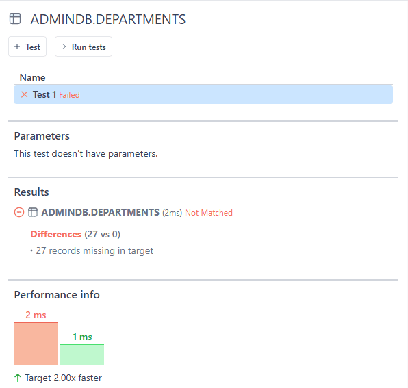 Each test, besides correctness, also tracks performance. For example, the following test indicates that the table we are testing contains 27 records in source staging database yet no records in target staging database. Not surprising, target database returns data faster than the source.